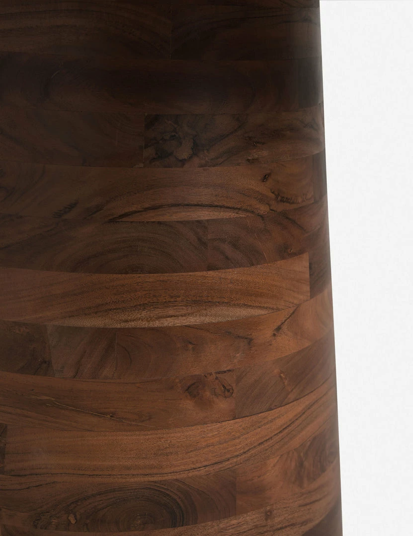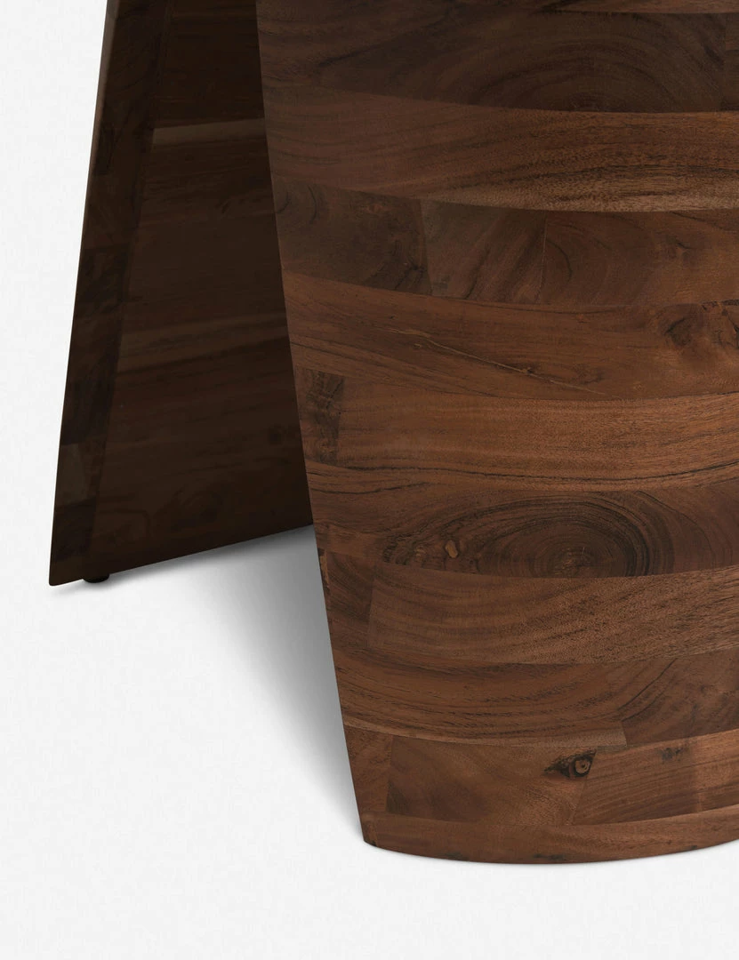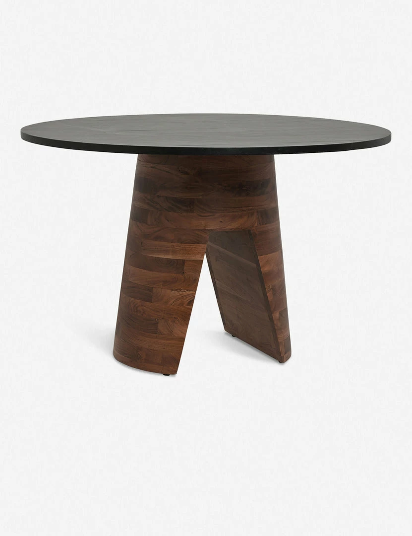 The unique profile of this round dining table offers an eye-catching focal point that is constructed from slabs of acacia wood for a richly layered woodgrain texture. Style this table with some rough-hewn dining chairs and sculptural accents for a dining room that strikes a perfect moody aesthetic.