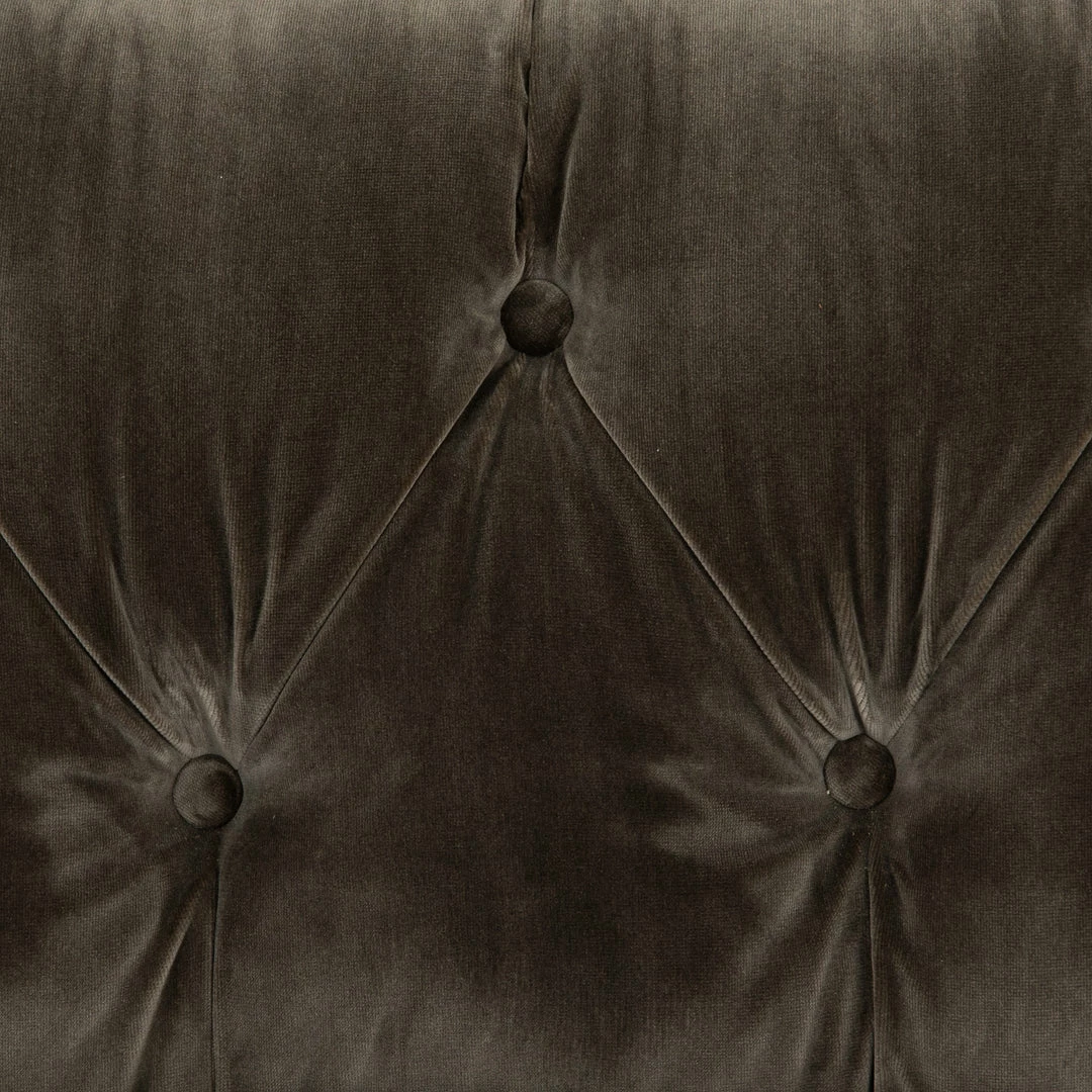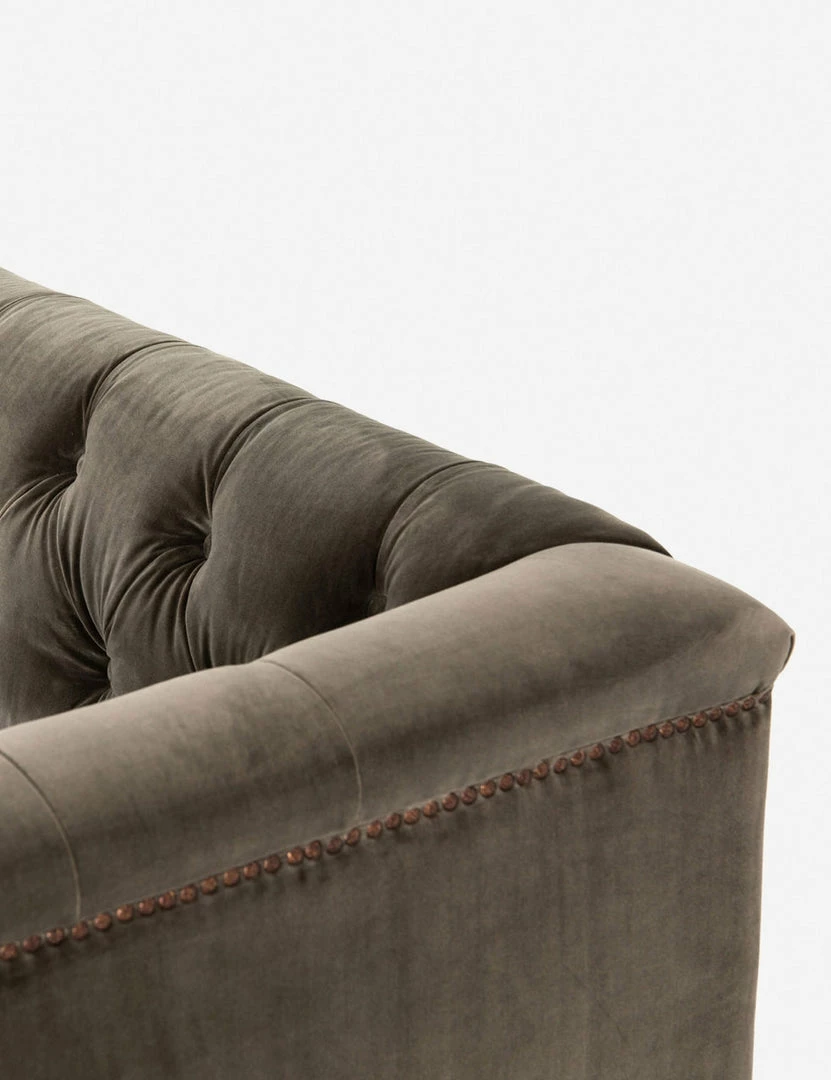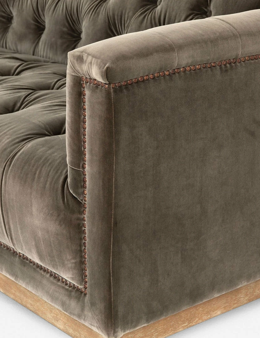 This tufted velvet sofa with aged bronze nailhead details gives a traditional library feel while the rectangular wood base gives it a modern and elevated edge. We love styling it with mid-century pieces and industrial accents for a layered look.