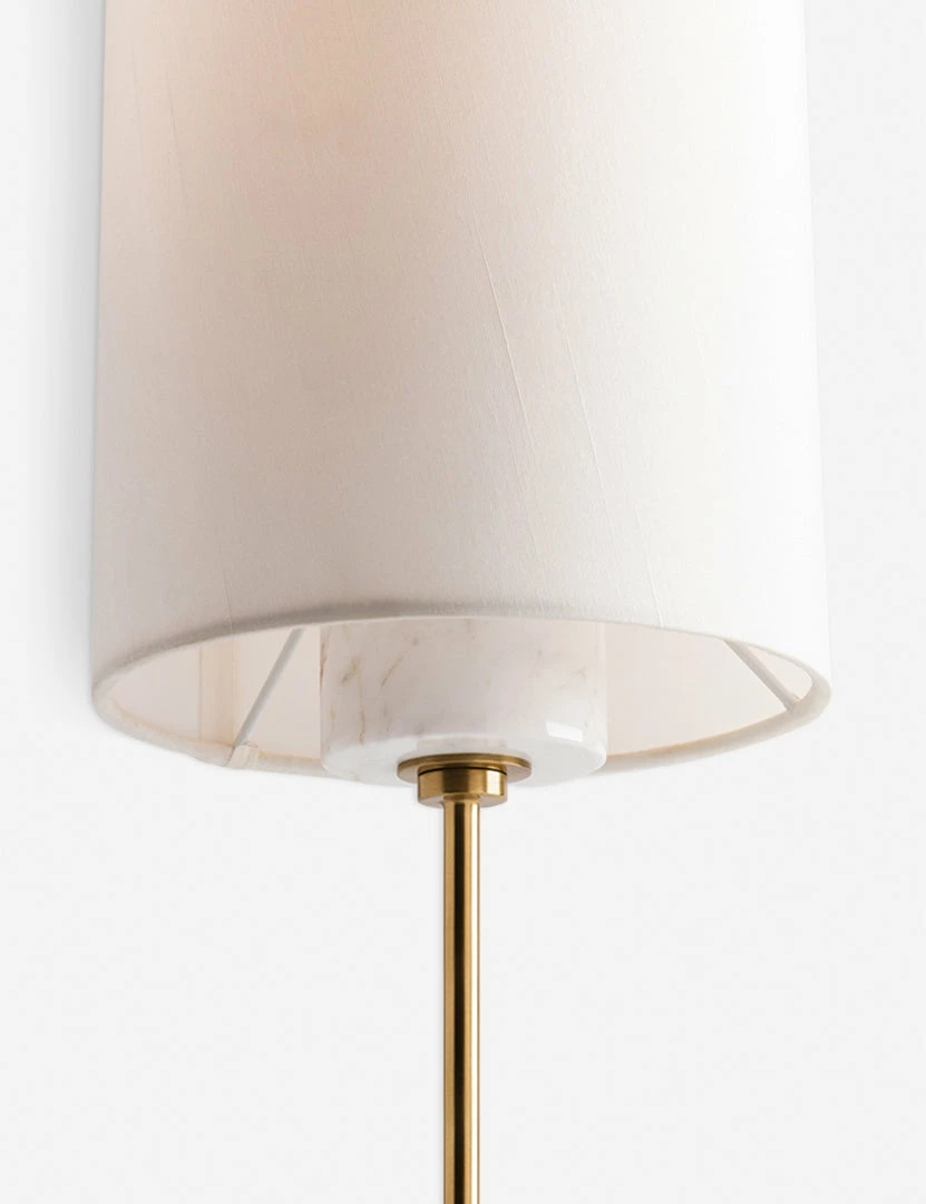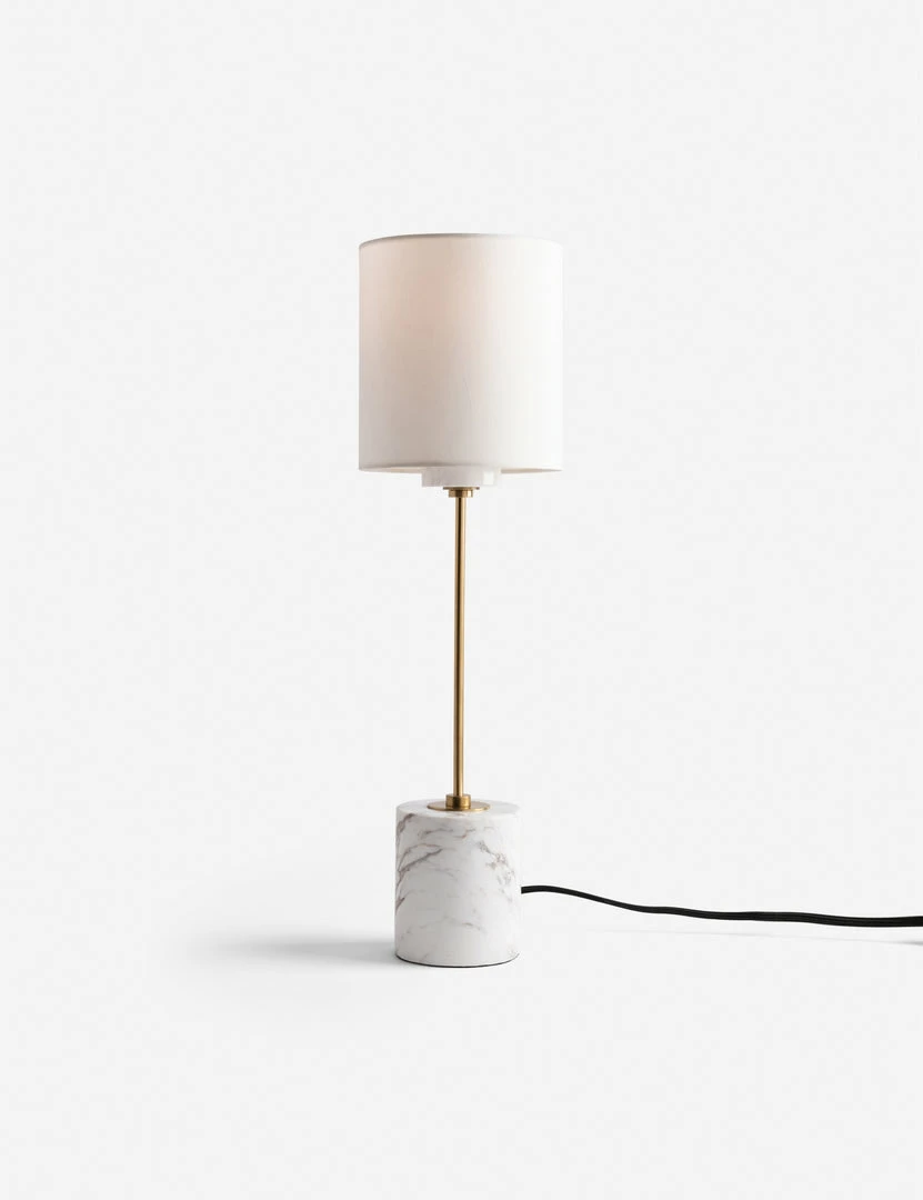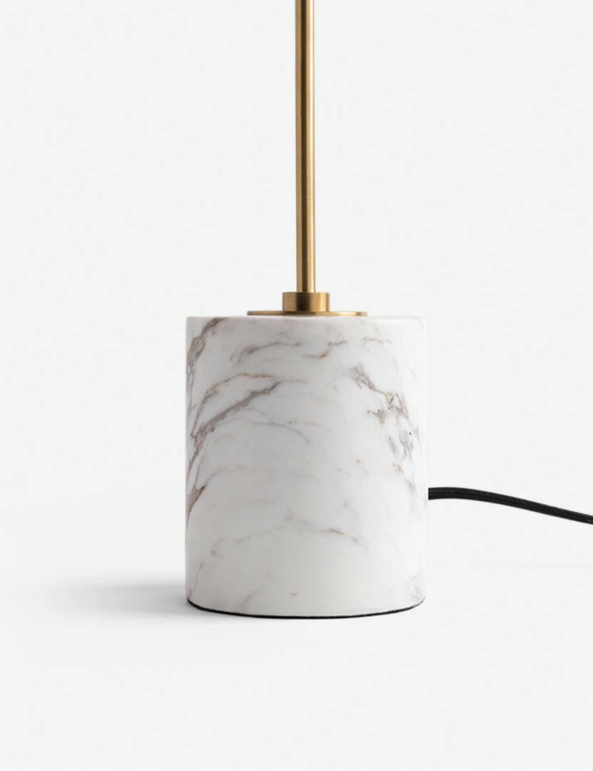 Combining traditional style with modern, this table lamp features a simple fabric shade, sleek golden hardware and a luxe marble base.