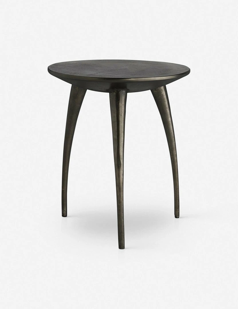 While this side table is undeniable a modern piece, there’s an eclectic charm to the look. Three tapered, bowed legs support a round top in an industrialist graphite aluminum for a sculptural effect.