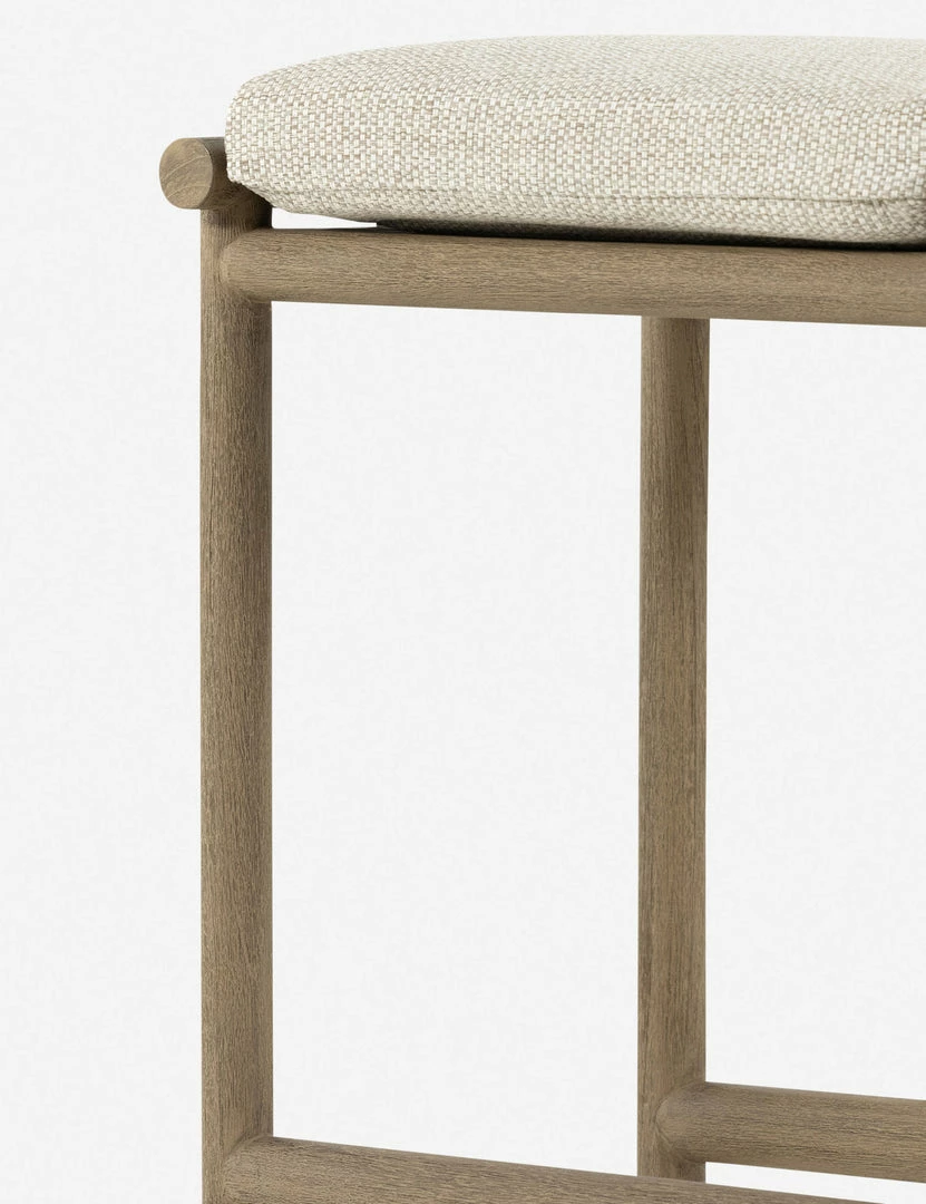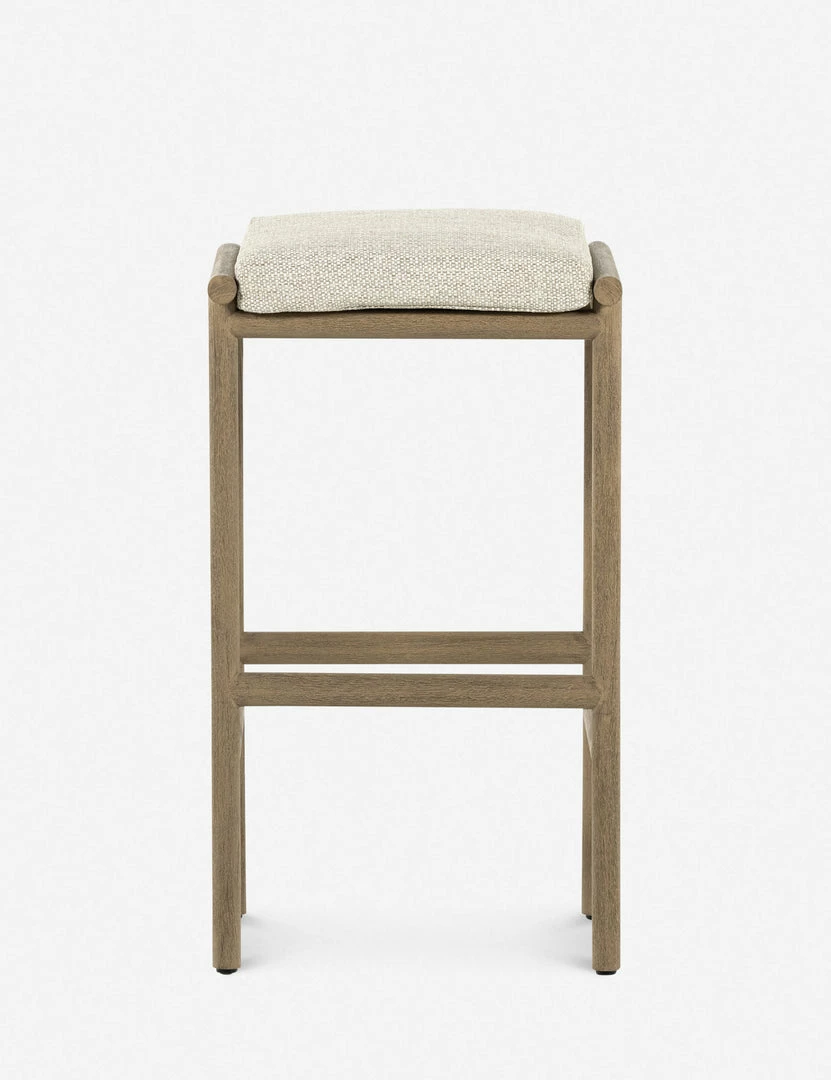This bar stool offers a dynamic, flexible seating option with a solid teak frame and removable cushion, upholstered in a performance fabric designed to hold up against the elements. Perfect for a poolside bar or styled with a textural outdoor rug, this stool helps to create a laid-back transitional space filled with coastal undertones.