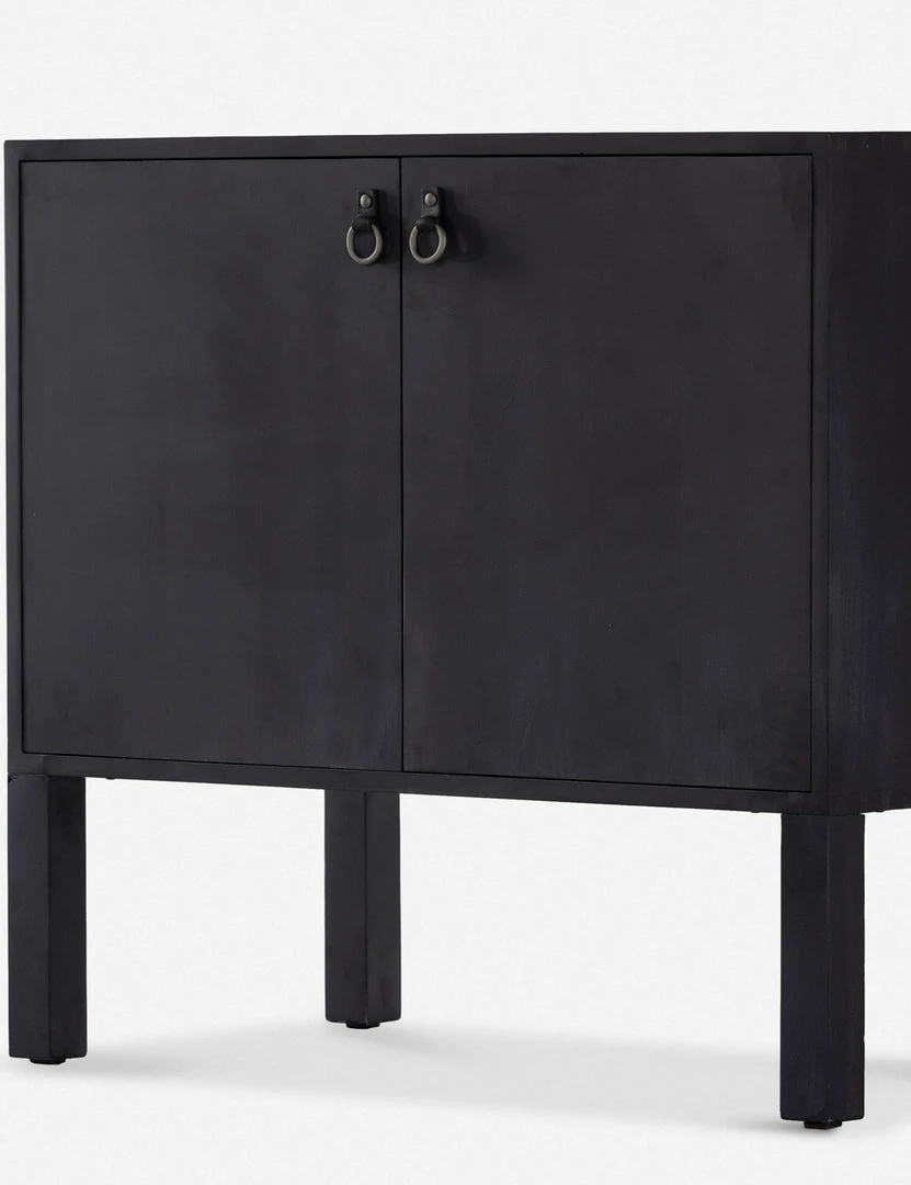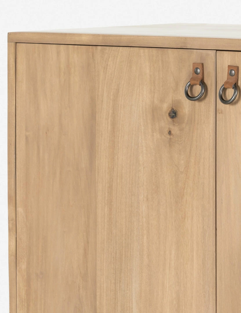 Pared-down lines and rough-hewn texture define this bar cabinet, bringing a simple, sophisticated look to your space. Crafted from solid poplar, it’s a fresh update to Shaker-inspired style. Cabinet doors finished with iron and leather pulls open to spacious storage for bottles, barware, and more.