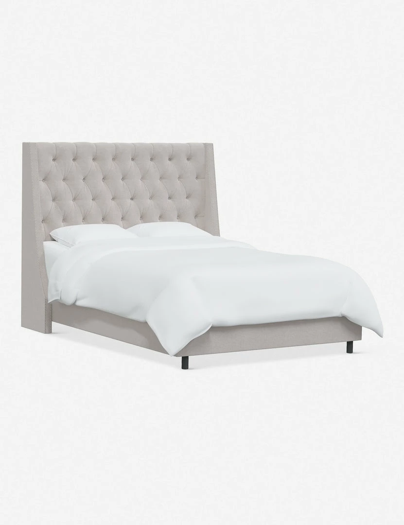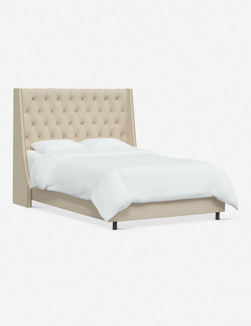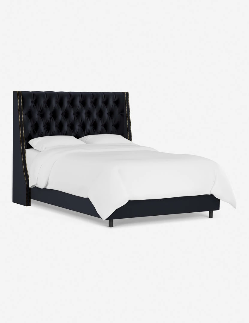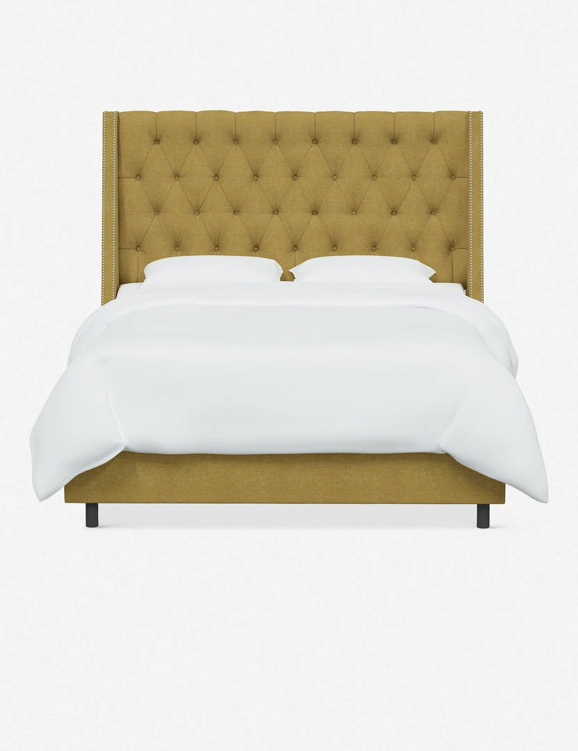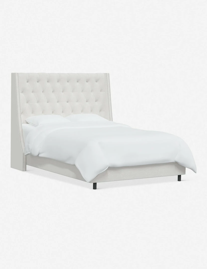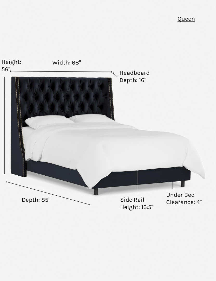 Traditional style is given a modern treatment in this bed with its tufted headboard, subtly winged with orderly rows of upholstery tacks. With a design set for a luxe night’s rest or morning cup of tea, this bed frame can suit a vintage-inspired aesthetic or bring a touch of chic visual texture to a tailored space.