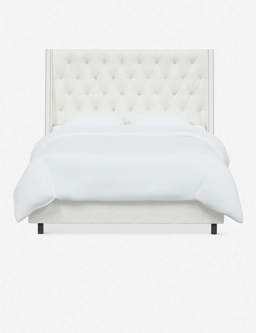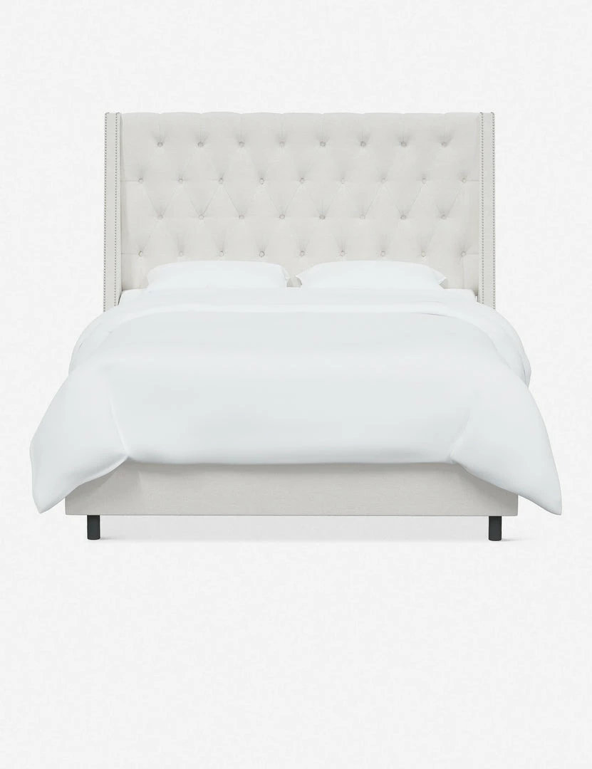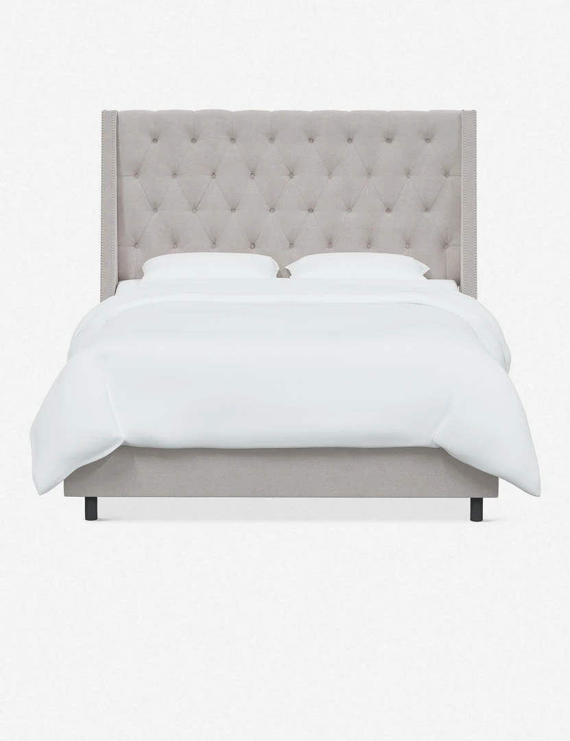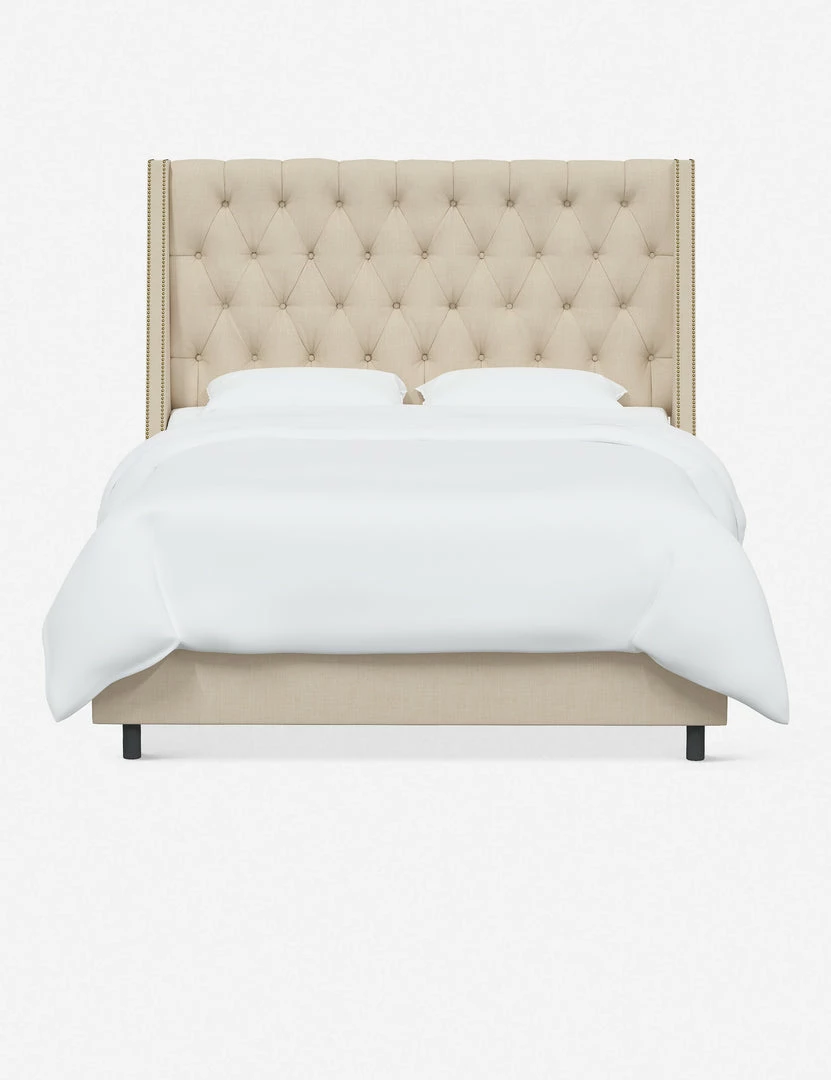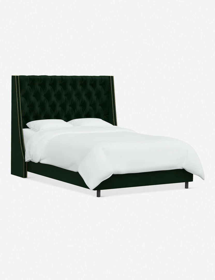 Traditional style is given a modern treatment in this bed with its tufted headboard, subtly winged with orderly rows of upholstery tacks. With a design set for a luxe night’s rest or morning cup of tea, this bed frame can suit a vintage-inspired aesthetic or bring a touch of chic visual texture to a tailored space.