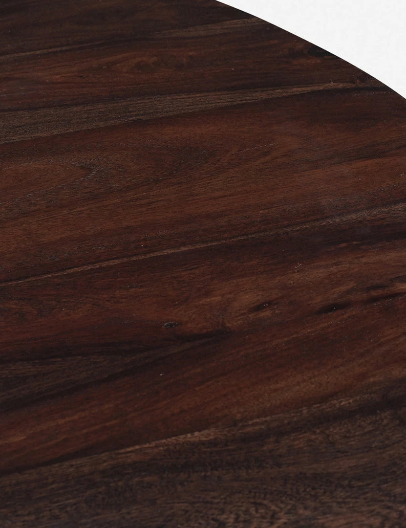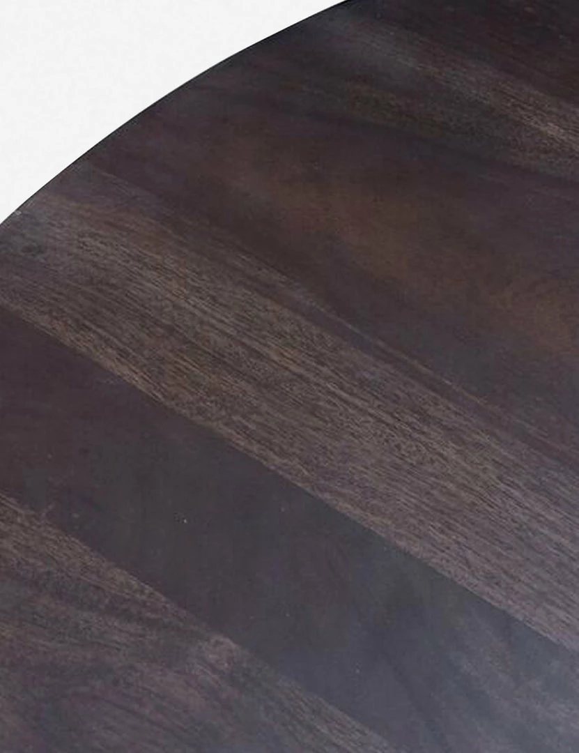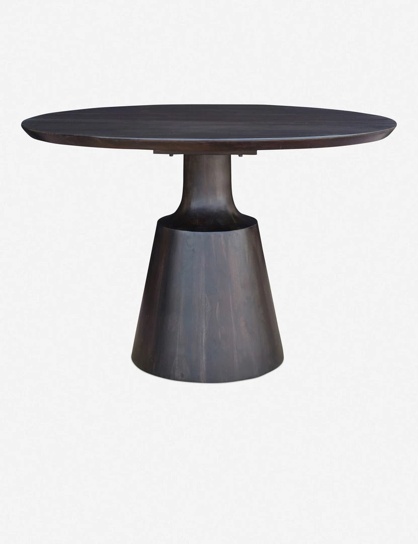 A contemporary silhouette made from solid sheesham timber for long-lasting appeal. This table’s smooth round surface, tapered cone-shaped pedestal, and rich dark finish brings a boldness to the dining room for instant allure.