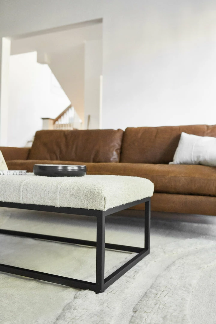 Kick back in style with this high-texture ottoman, upholstered in a boucle fabric with a sleek metal base. It’s a modern look that’s not afraid of a little whimsy!