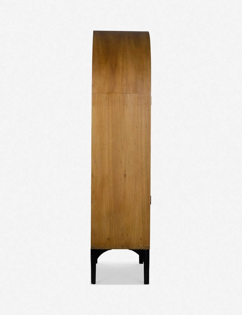 Fashioned from acacia wood with pin and half-moon joints, the architectural lines of this acacia wood cabinet create an arched profile that feels at once timeless and modern. With a matte black interior, and adjustable shelves, this curio cabinet is perfect for displaying your favorite books and décor– plus a spacious lower drawer offers extra storage.