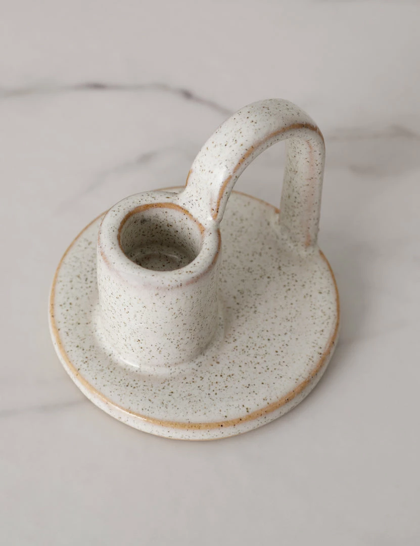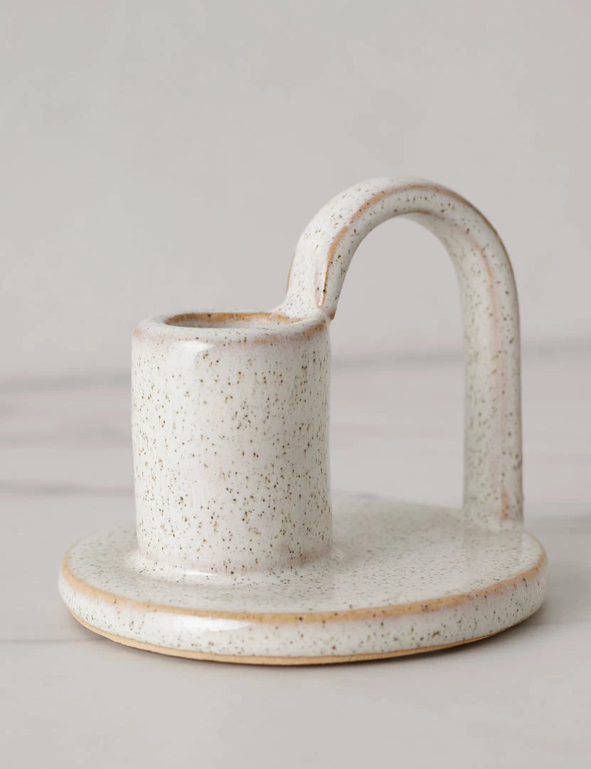 Bring a timeless ceramic charm to your mantle or tablescape with this handled taper candle holder. The reactive glaze features a speckled detail with browned edges for a tone tailored to farmhouse chic.