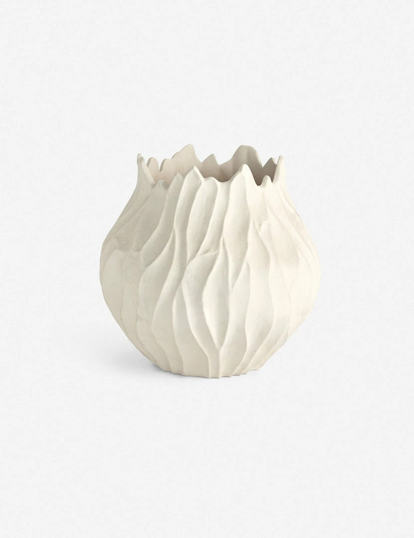 Portuguese ceramic artisanry brings luxe appeal to this large vase. The rippled surface and organic mouth evoke a botanical beauty with a matte white finish to offer a delicate tone to your living space or entryway decor.