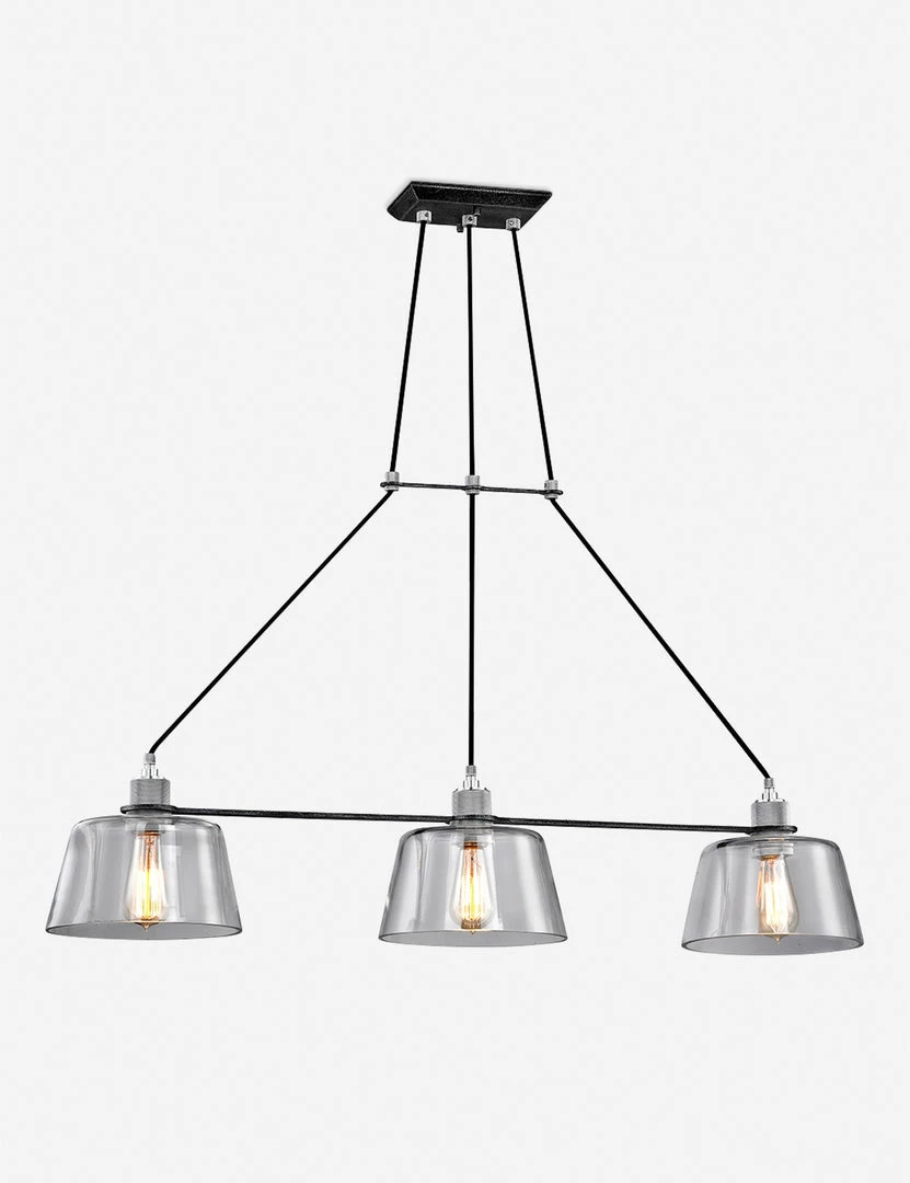 Subtly flared glass shades, a blackened iron frame, and matte white metal accents lend this hanging ceiling light a dramatic, minimalist look. This overhead lighting’s clear glass radiates bright light that opens up a room and seamlessly blends in with your space’s aesthetic. Style it above a dining room table, kitchen island, or in your entryway or hallway.