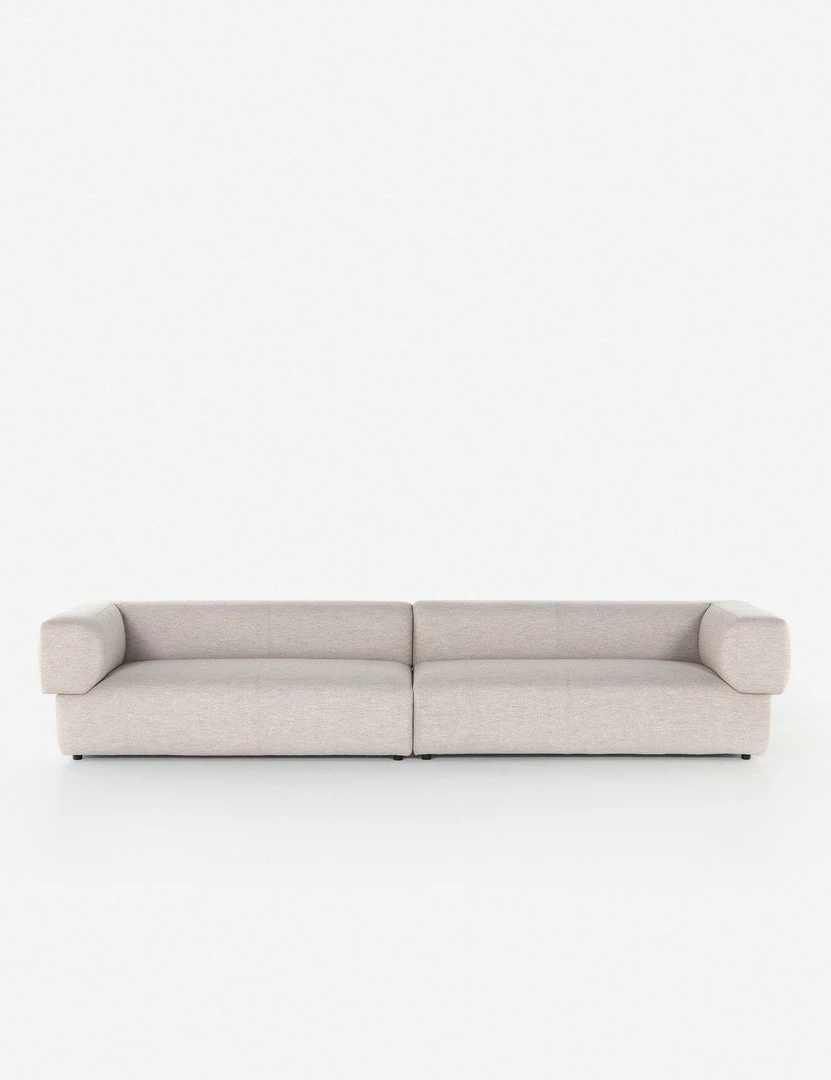 A plush tailored design wrapped in a high-performance fabric with a softness resembling a blend of boucle and linen makes this sectional sofa a refined touch of modern comfort. A long profile make this a great sectional couch to provide ample space for sprawling comfort. Style with natural textures and organic accents for a cozy California feel.