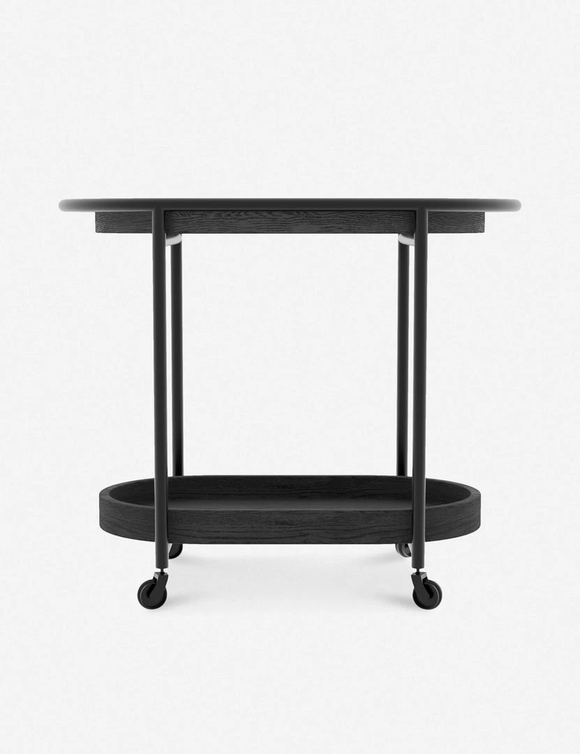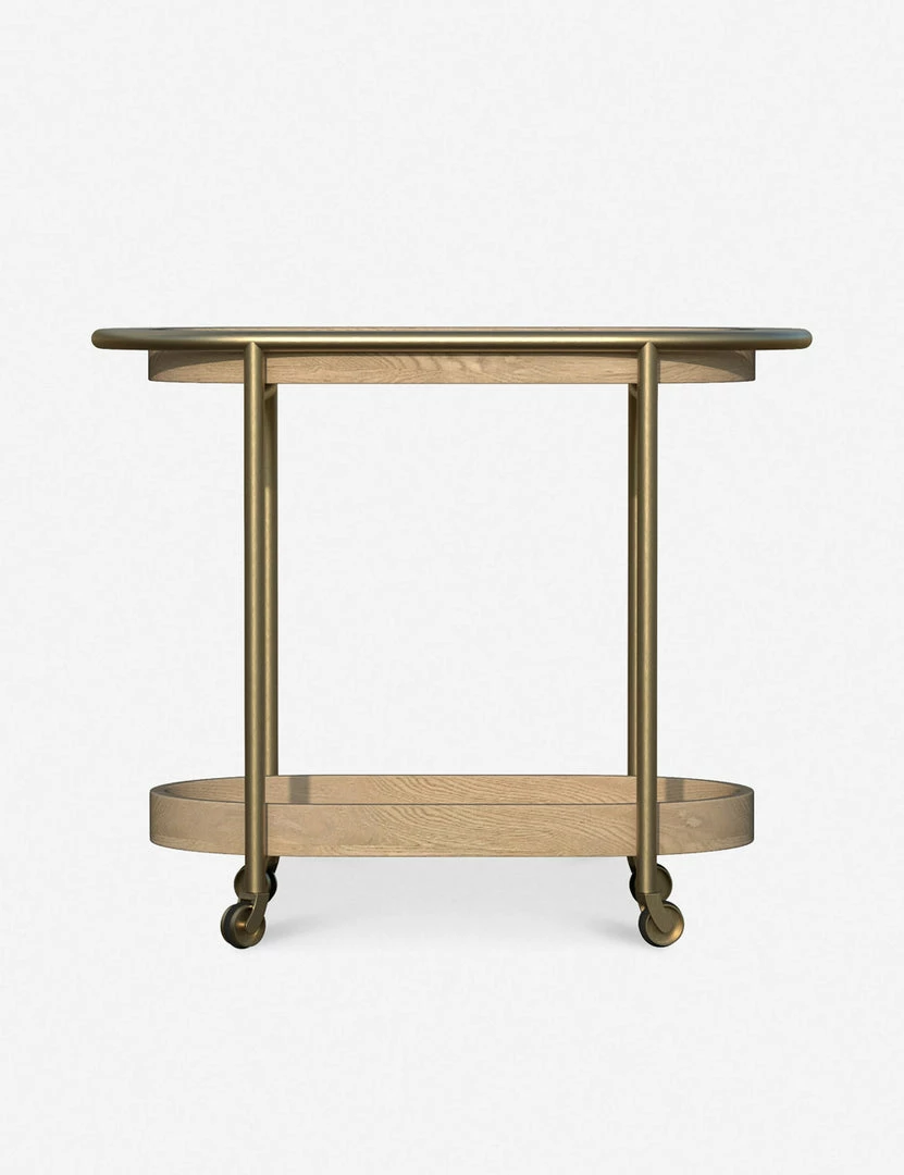 A steel tube frame holds two oak tray shelves in this simply stylish bar cart. This versatile design offers mixed-material appeal in a finish to suit your look. Plus, the casters let you float your bar anywhere in your space when you’re entertaining to bring a dynamic touch.