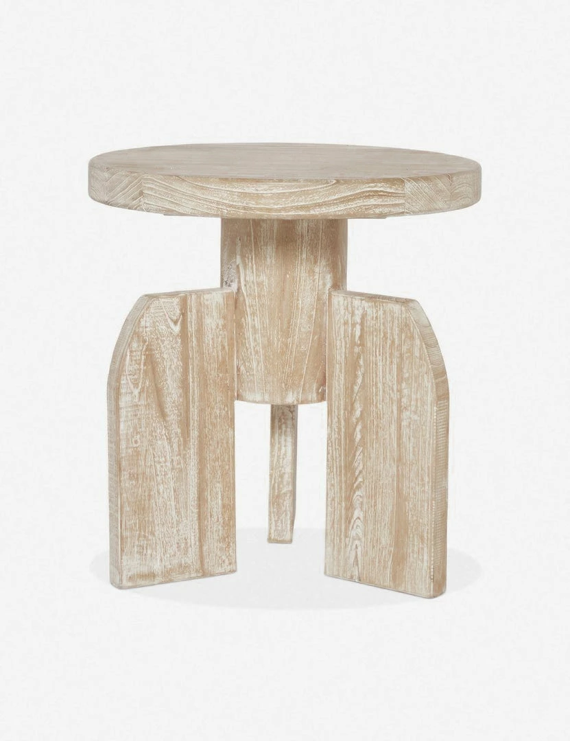This side table features a blend of geometric shapes for a truly unforgettable look. The distressed mindi wood adds just a hint of earthiness to the overall feel, making this accent table a versatile option that suits a softer take on modern aesthetics.