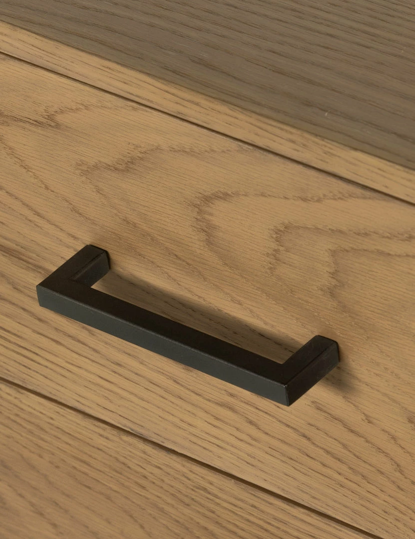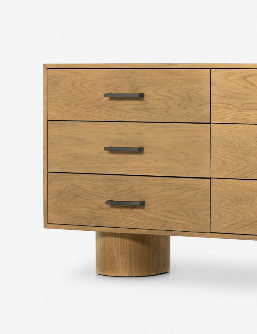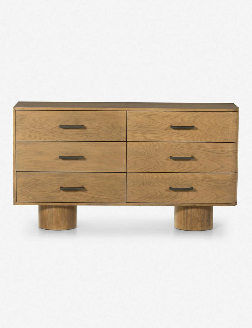 Bring a dramatic edge to your bedroom set with the Cyrus Collection. Clad in an oak veneer burnished to highlight its beautiful natural grain, this dresser sits on chunky cylinder legs setting off a unique silhouette. Six spacious drawers with iron pulls offer ample storage while the single curved side creates a perfect touch of contrast.