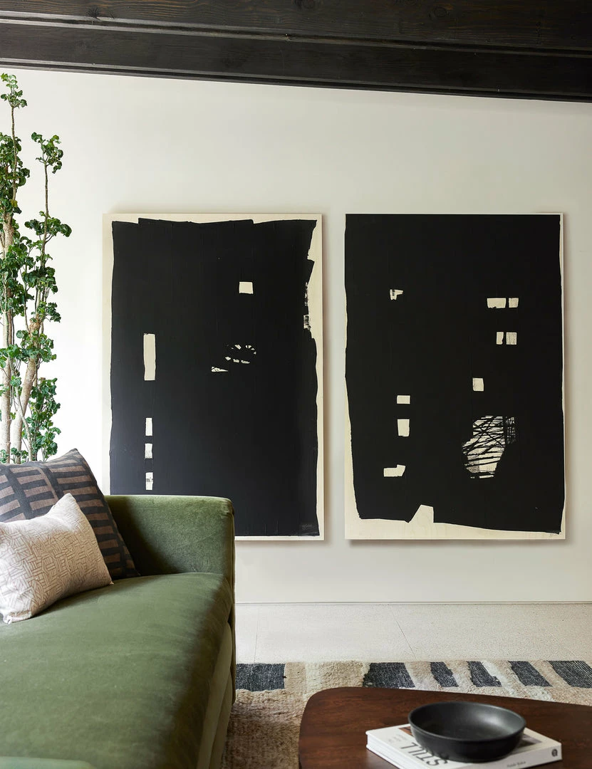 A minimalist composition offers visual impact in this abstract wall artwork by contrasting a dominant black form against the natural wood grain backdrop. Each piece in the Davao series is created by applying giclée printing to a birchwood plank and then embellished by hand to offer a striking, modern element for a gallery art wall or standalone feature piece.