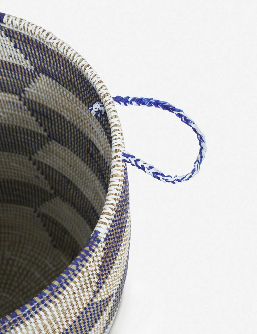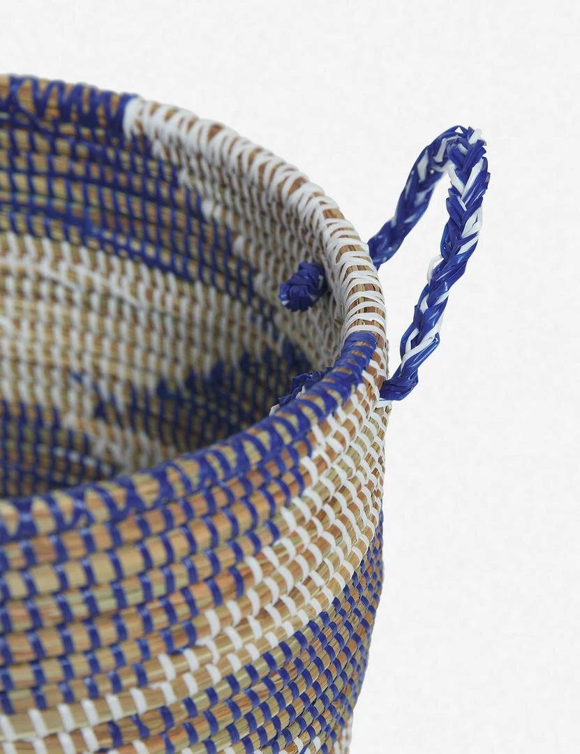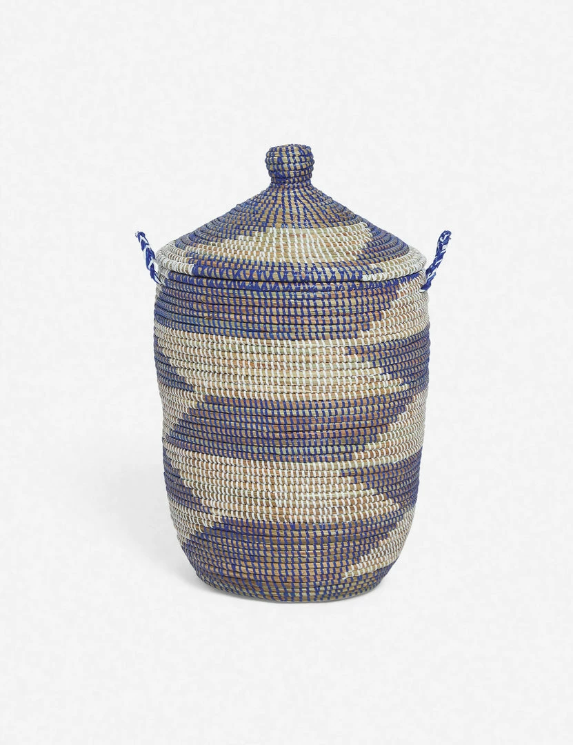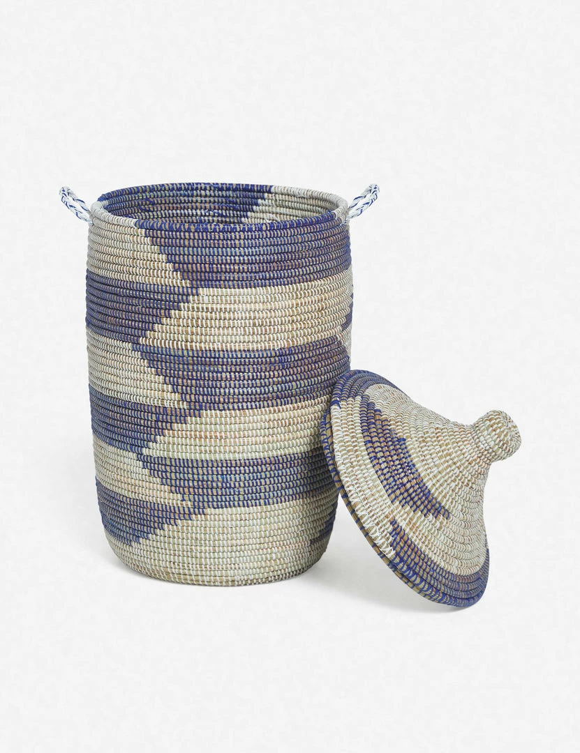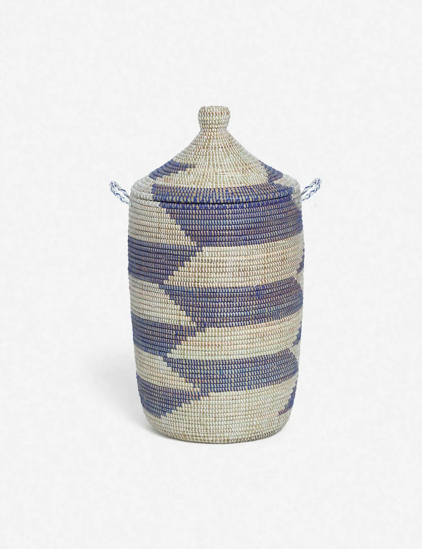 Intricately crafted by Senegalese artists using a traditional coil-style weaving technique passed down for generations, this large storage basket is woven from elephant grass and recycled plastic to offer a unique textural layer. This laundry hamper and lid are an eye-catching design element with a rich artisanal story and provide a functional touch for storage or laundry. Featuring a blue design, each handmade storage basket is one of a kind and will have slight variations in color.