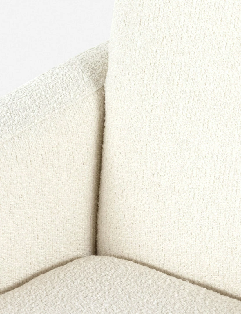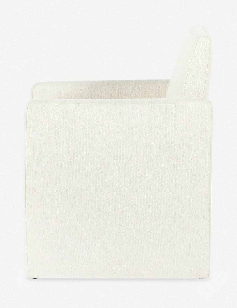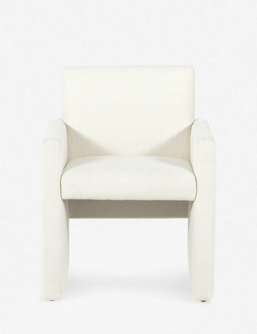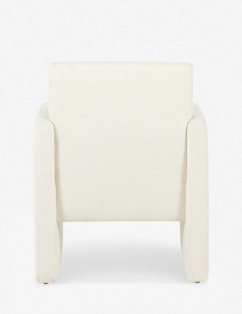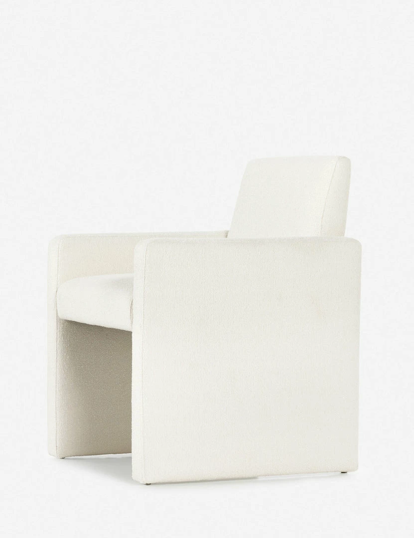 White performance fabric suits this dining room chair for stunning impact. The delicate lines and plush seat, arms, and back offer endlessly soft appeal in a dining chair design that will elevate your table with crisp perfection.
