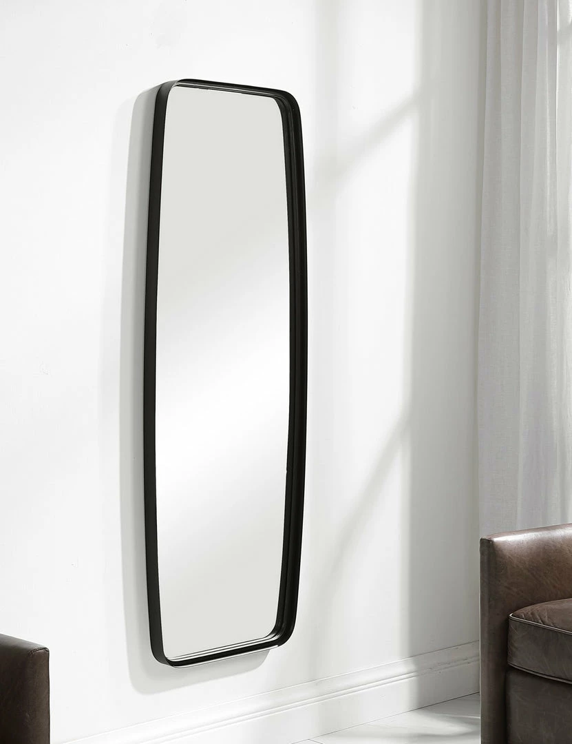 With a matte black or antiqued gold finish and subtly curved design, this full length wall mirror expertly combines a sleek, modern look with everyday functionality. This framed full body mirror is an ideal fit for your bedroom, walk-in closet, or your entryway.