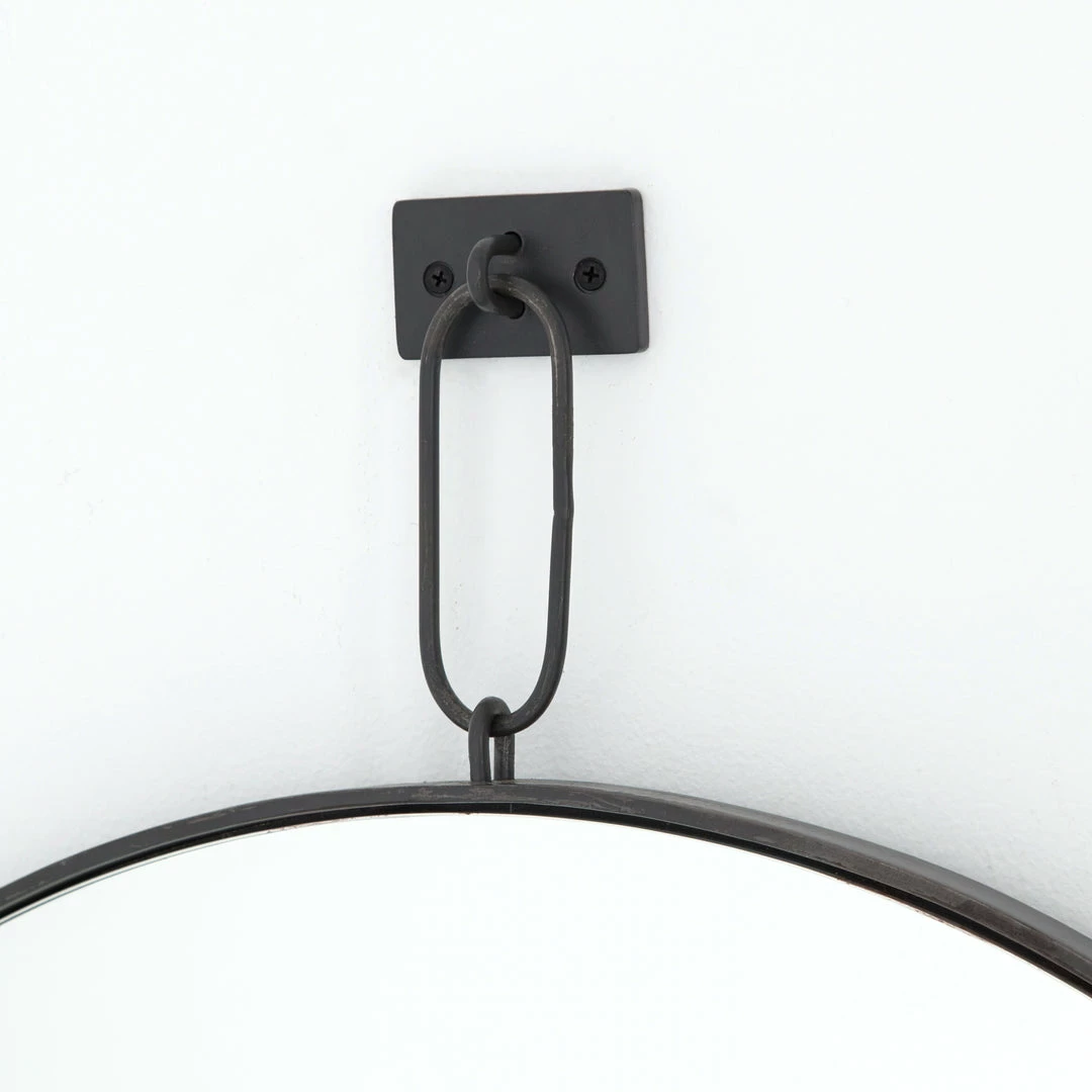 This circular mirror hangs from a special clasp, giving it a more industrial feel. Mix with exposed brick and natural woods to complete the look.