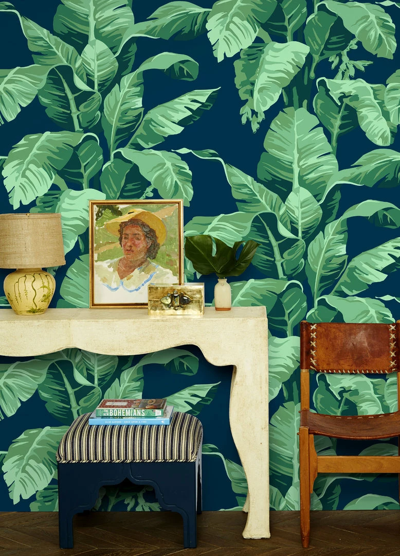 Take your walls from blah to California dreamy with this palm-print wallpaper from the exclusive collection by interior designer Nathan Turner. The illustrated effect and bold, colorful design create a trend-forward look.