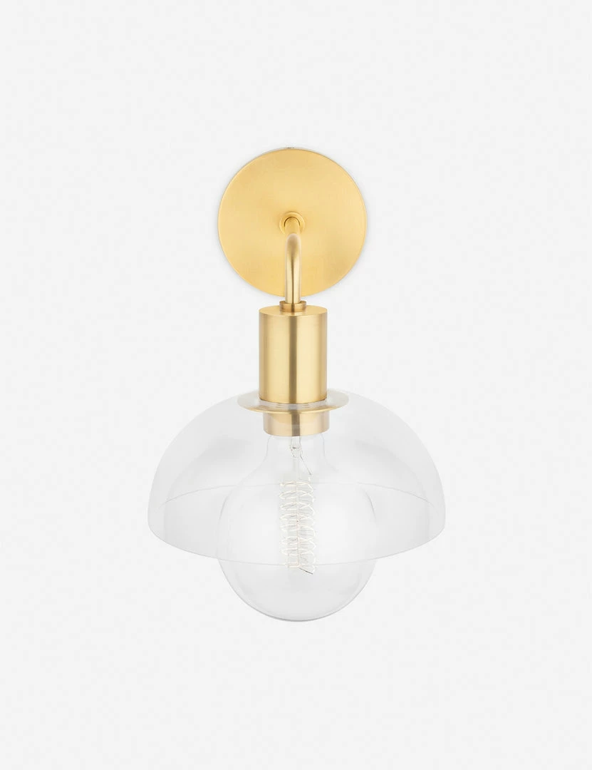 This industrial-chic sconce is the perfect transitional piece for hallways, kitchens and living rooms. Clear glass shows off the filament detailing, and golden aged brass finishes the look with a sleek shine.