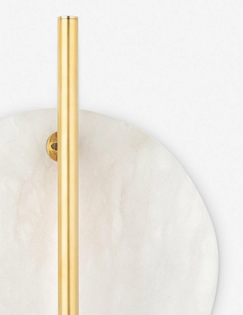 The translucent visual texture of the alabaster discs and a gleaming antique brass finish mark this unique sconce with a luxe air that make it a stunning addition to a refined space. An elevated choice for an indoor wall light fixture, this sculptural accent piece casts a gentle pool of delicate light when lit.