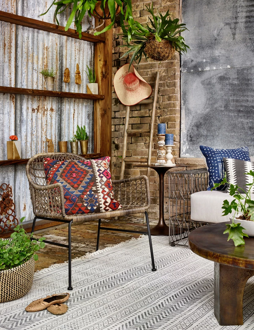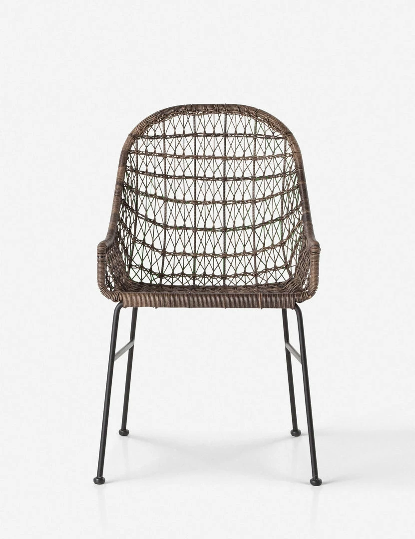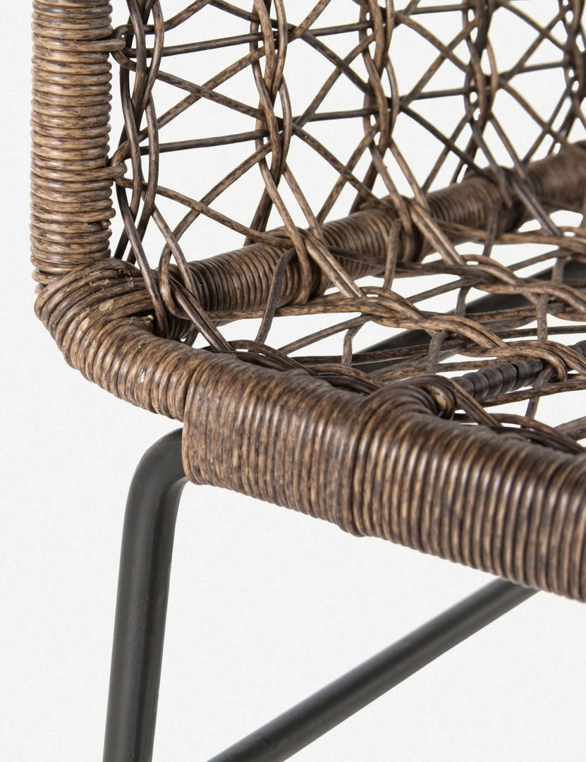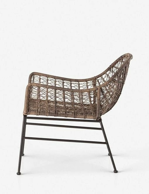 All-weather wicker makes this open-weave club chair perfect for both indoor and outdoor lounging. A minimal black iron base and low-profile arms keep the look contemporary with mid-century flair.