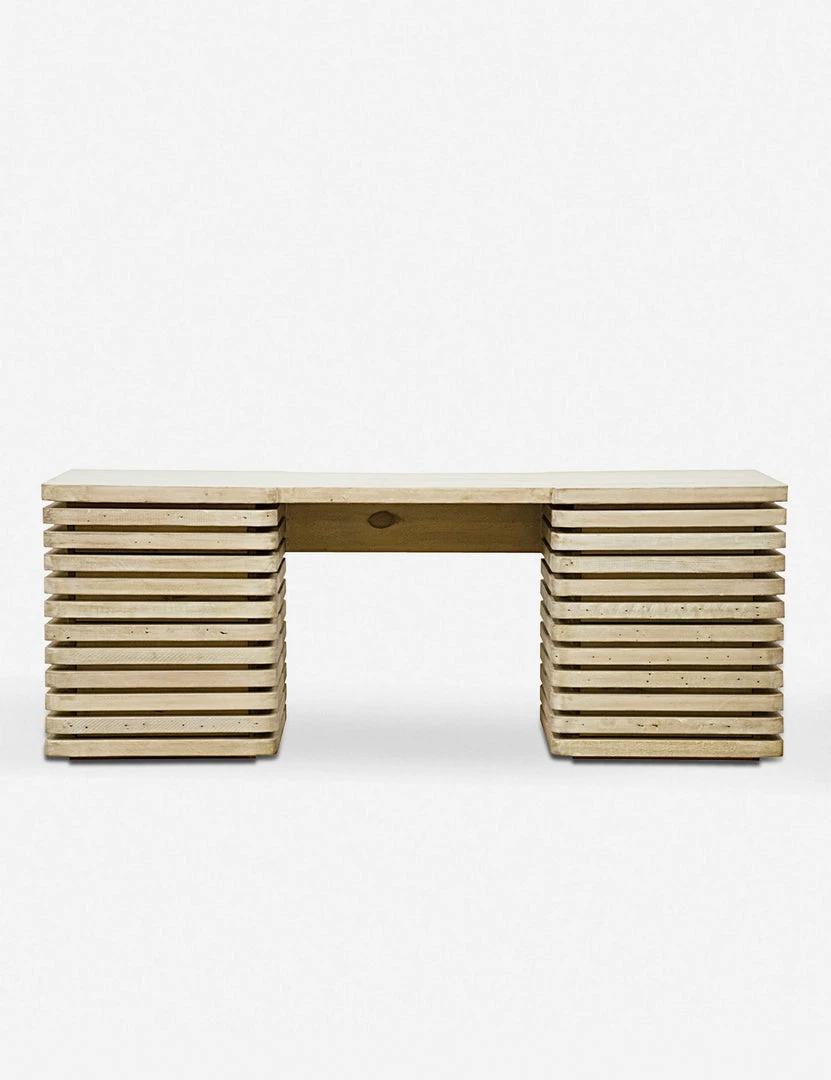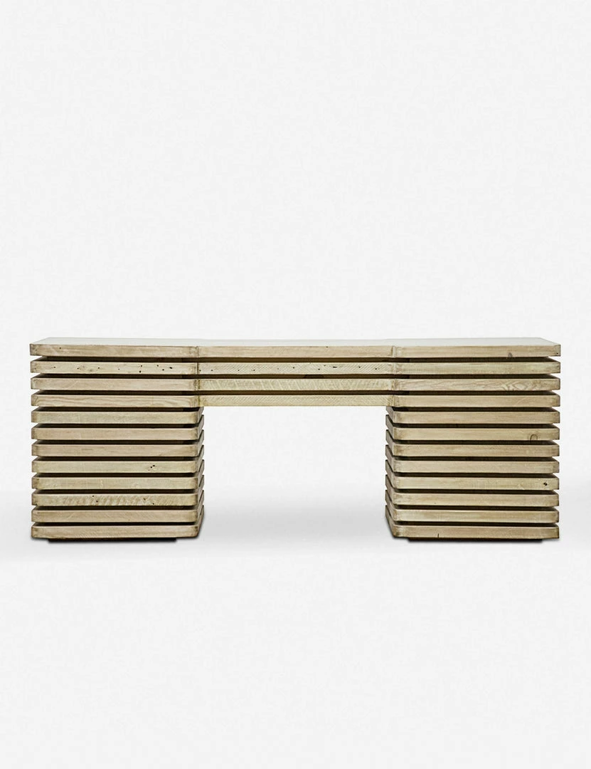 A modern aesthetic with architectural influences characterizes the Ellery desk. Stacked slats in reclaimed wood seem to float in midair thanks to the recessed base. As functional as it is unique, this piece has a total of six concealed drawers to hide clutter and keep your office looking clean and sleek.