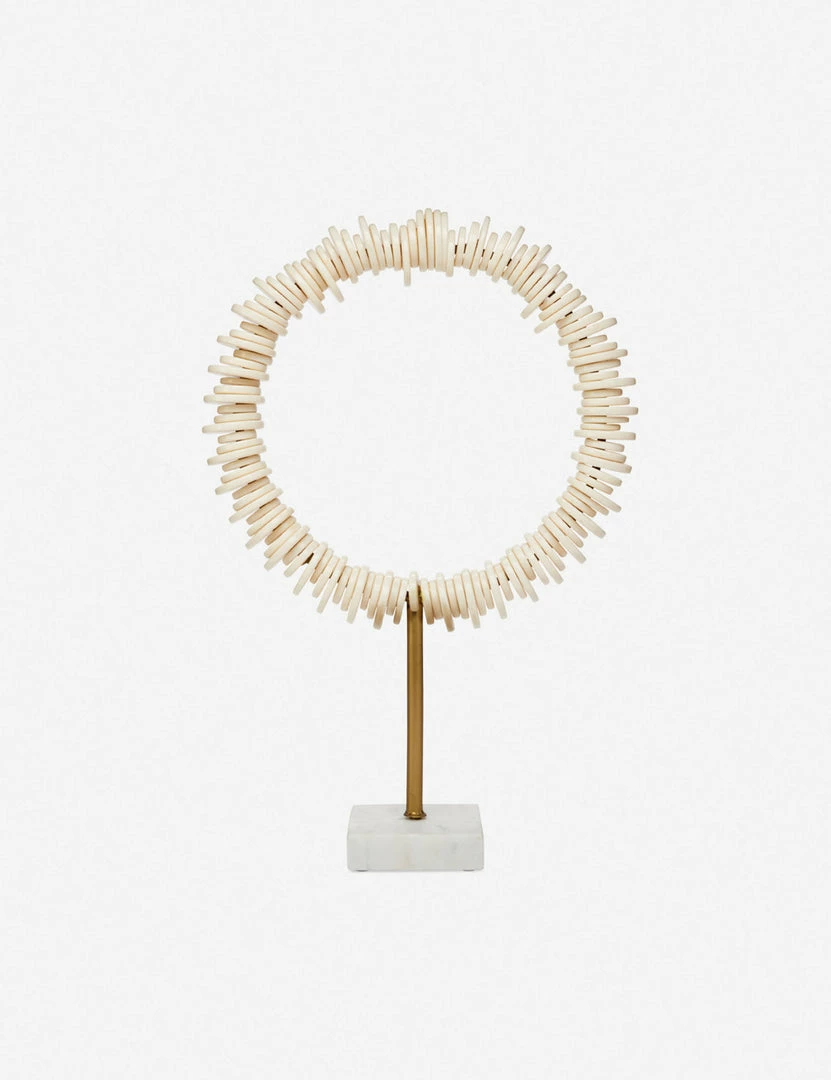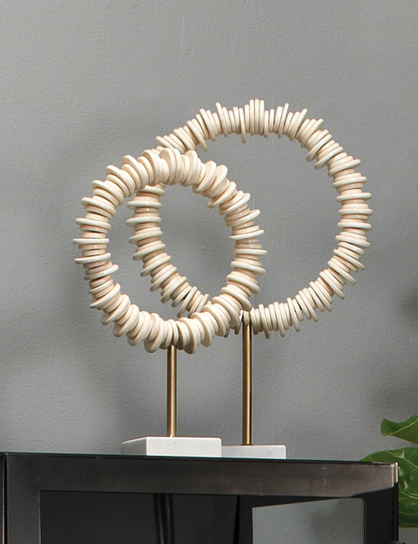 Bring an art-forward element to your look with these dynamic sculptures. Resin discs thread a brass-finished stand forming an intricate ring in each piece. The marble bases offer a striking presentation on a bookshelf or mantel.