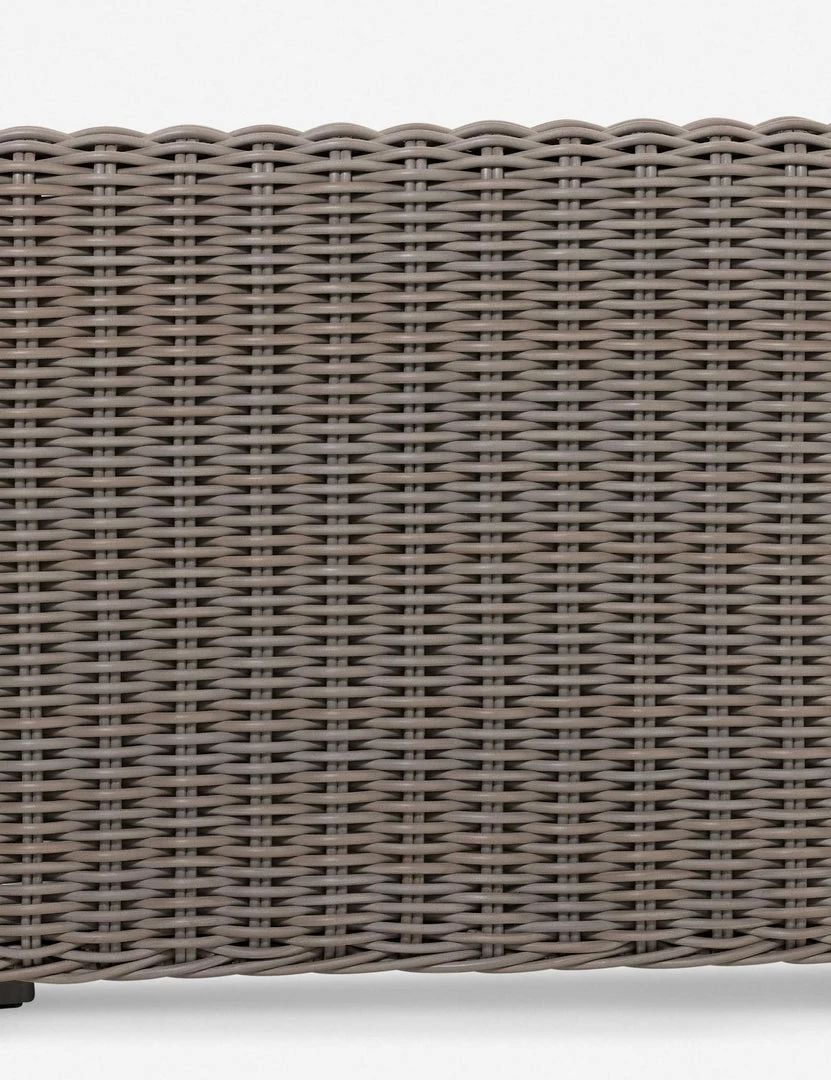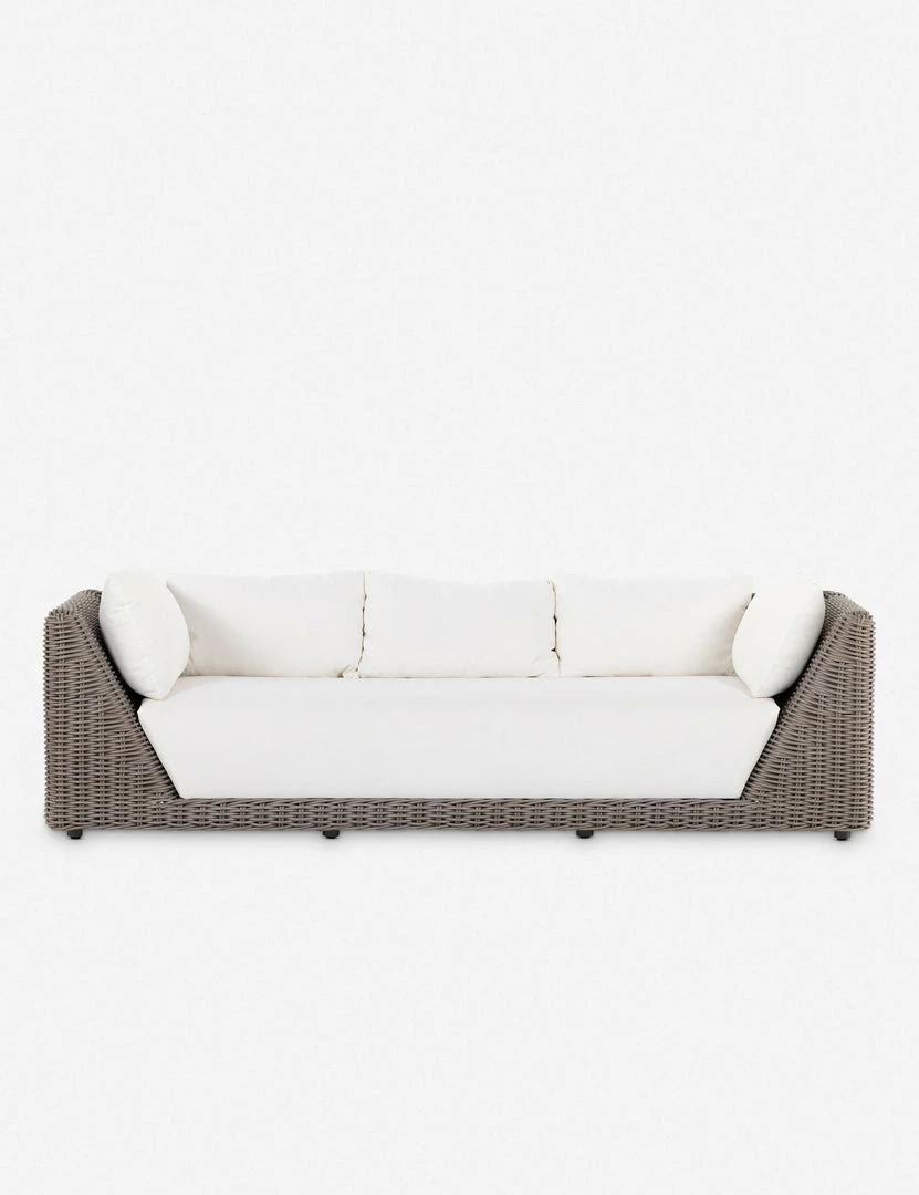 Pairing a plush, airy style with sculptural lines, this dynamic wicker sofa is perfect for a social, fresh-air lounge. The all-weather wicker frame forms an angular silhouette fit with performance upholstered cushions for a versatile couch you can style from the sunroom to the patio.
