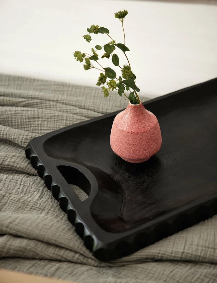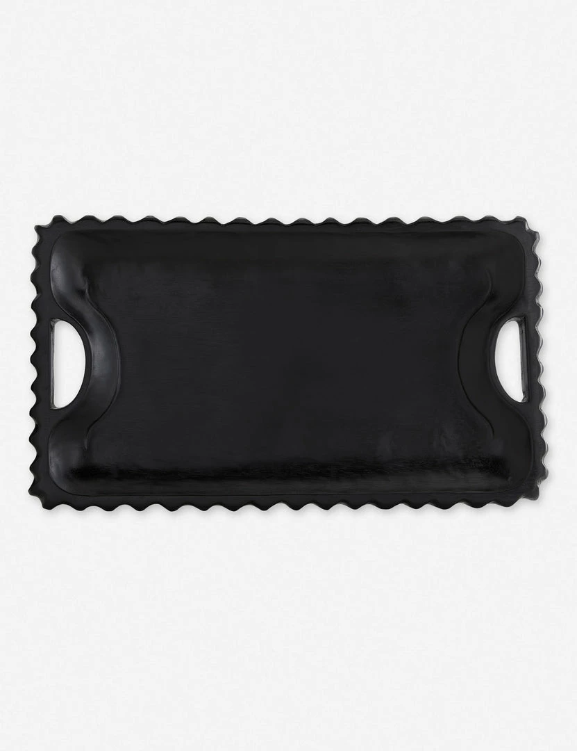 This food-safe wooden tray is a stunning way to serve up after-dinner coffee, Sunday brunch in bed, or just to display your favorite objects. The teak wood construction of this decorative coffee table tray features scalloped edges, two cutout handles, and a rich ebony finish.