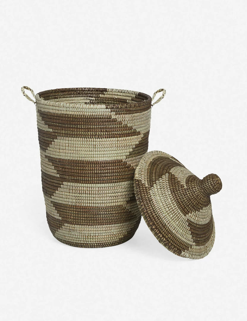 Intricately crafted by Senegalese artists using a traditional coil-style weaving technique passed down for generations, this large basket is woven from elephant grass and recycled plastic to offer a unique textural layer. This hamper and lid are an eye-catching design element with a rich artisanal story and provide a functional touch for storage or laundry. Featuring an earth tone design, each handmade and decorative laundry basket with a lid is one of a kind and will have slight variations in color.