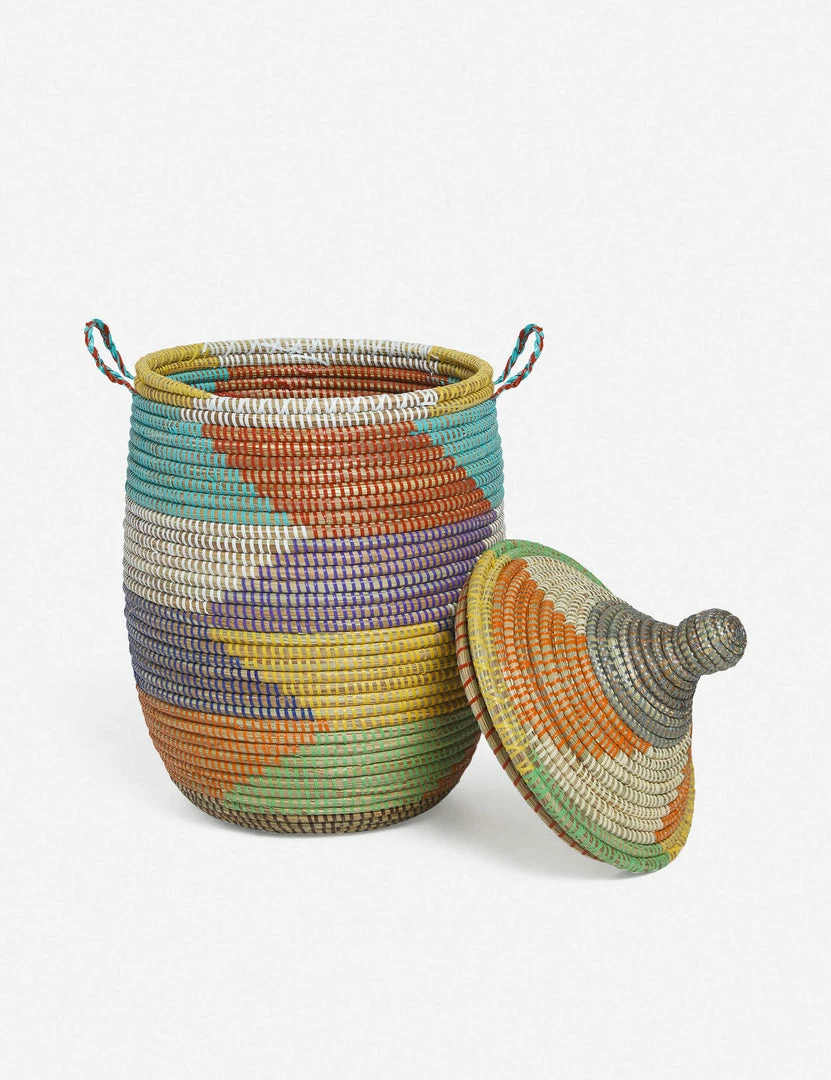 Intricately crafted by Senegalese artists using a traditional coil-style weaving technique passed down for generations, this large storage basket is woven from elephant grass and recycled plastic to offer a unique textural layer. This laundry hamper and lid are an eye-catching design element with a rich artisanal story and provide a functional touch for storage or laundry. Featuring a chromatic design, each handmade storage basket is one of a kind and will have slight variations in color.