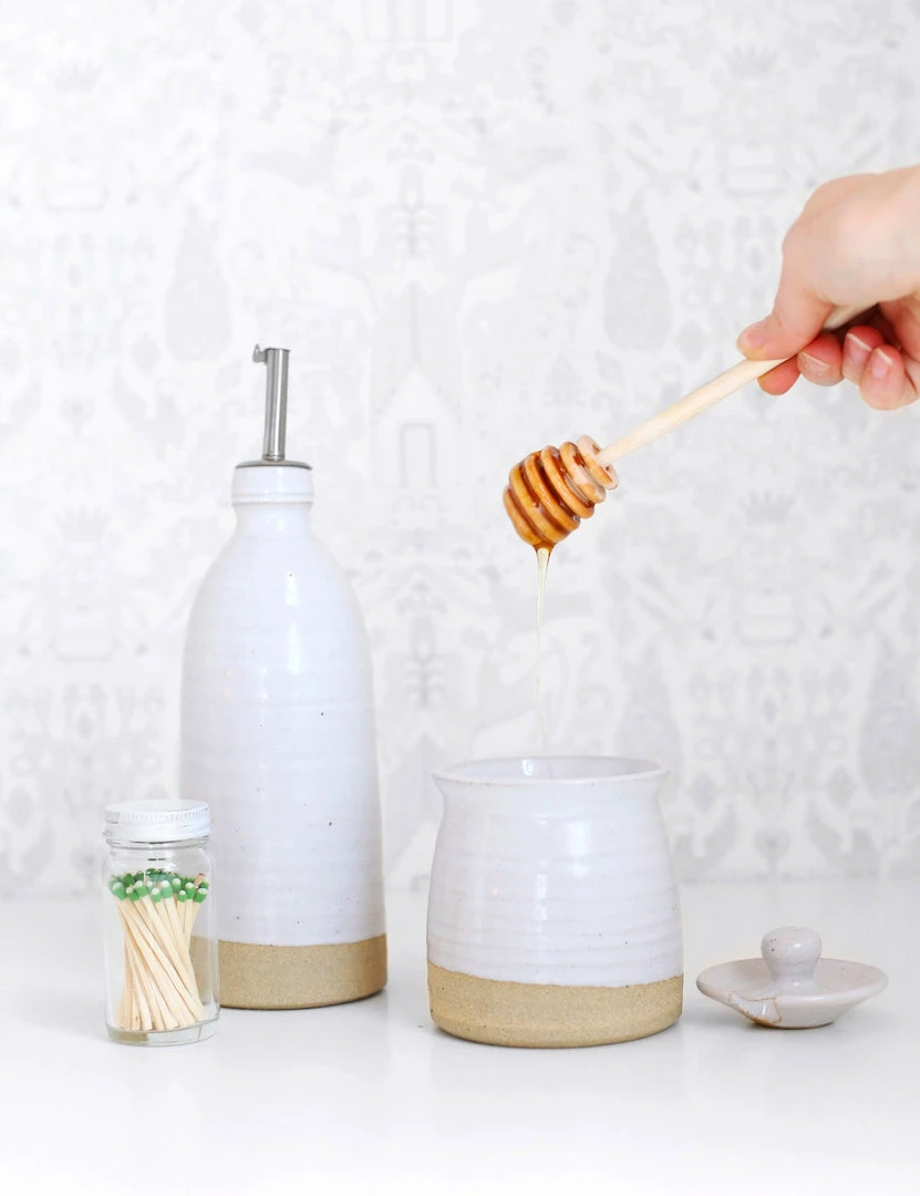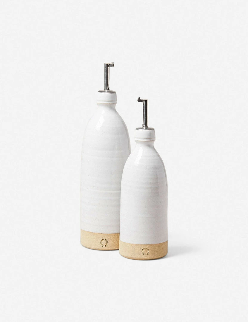 Modern with a farmhouse-chic twist, this olive oil bottle features a dipped ceramic glaze for an artisan touch. Cute enough to proudly keep on the dining room table, it adds a healthy dose French countryside charm.