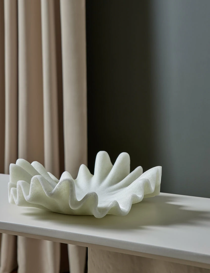 A stunning wave-like form and bright white finish lends this luxe centerpiece bowl a lively and nautical feel. Crafted from white ricestone, its textured rippled design extends down to a smooth center—making this piece a perfect way to showcase fruit, a glass lantern, or other decorative objects on an end table or coffee table.