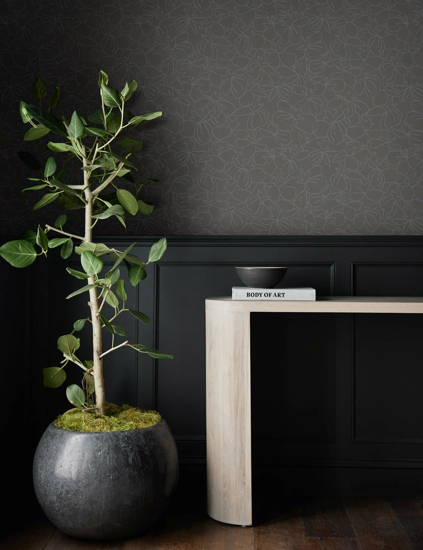 Artist Susan Hable’s experience in collage, sculpture, welding, drawing, and printmaking informs her uniquely inspired collection. Floral line drawings decorate a dark grey field to produce a wallpaper that strikes a tone of refined minimalism. Polish a room with this stylish home wallpaper to find the balance in a moody elegant space.