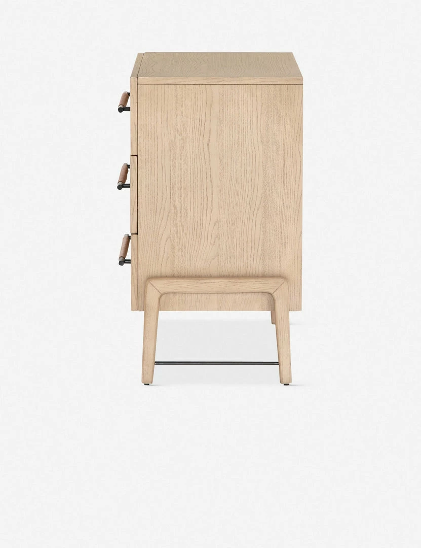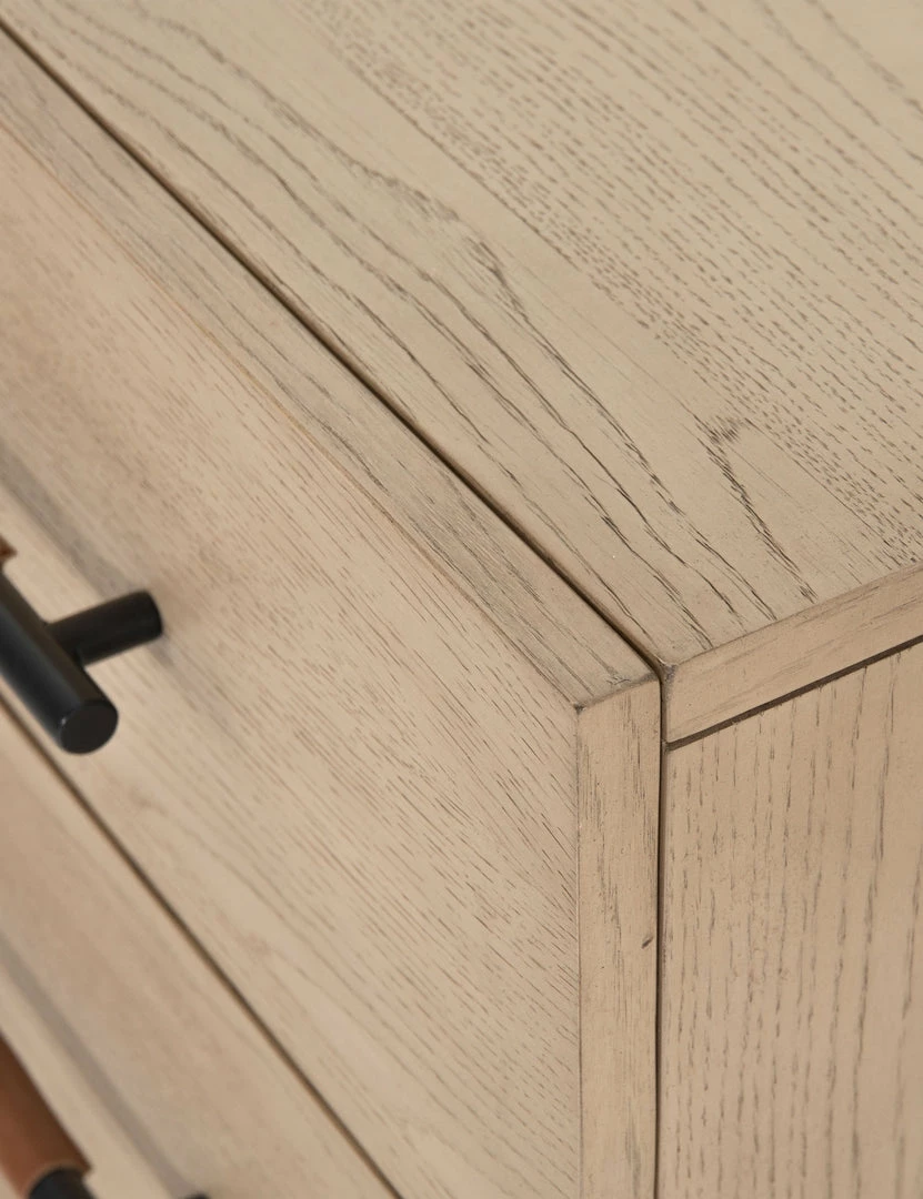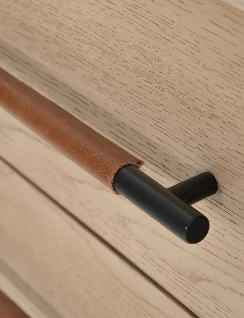 With its clean lines, sandy finish, and leather accents, this dresser brings a refined, minimalist effect to your bedroom. Constructed from solid oak and an oak veneer, it’s complemented by iron hardware and wrapped in tan top-grain leather. Three roomy drawers provide tons of storage space.