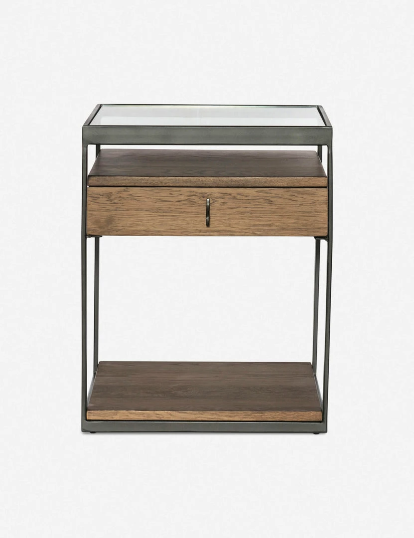 Industrial textures come together in a pared-down nightstand design. An iron frame suspends a floating oak drawer and tempered glass top. This bedside table’s dark finish and streamlined profile offer the perfect visual balance for a chunky modern bed.
