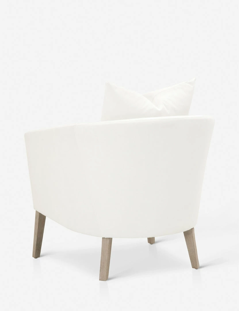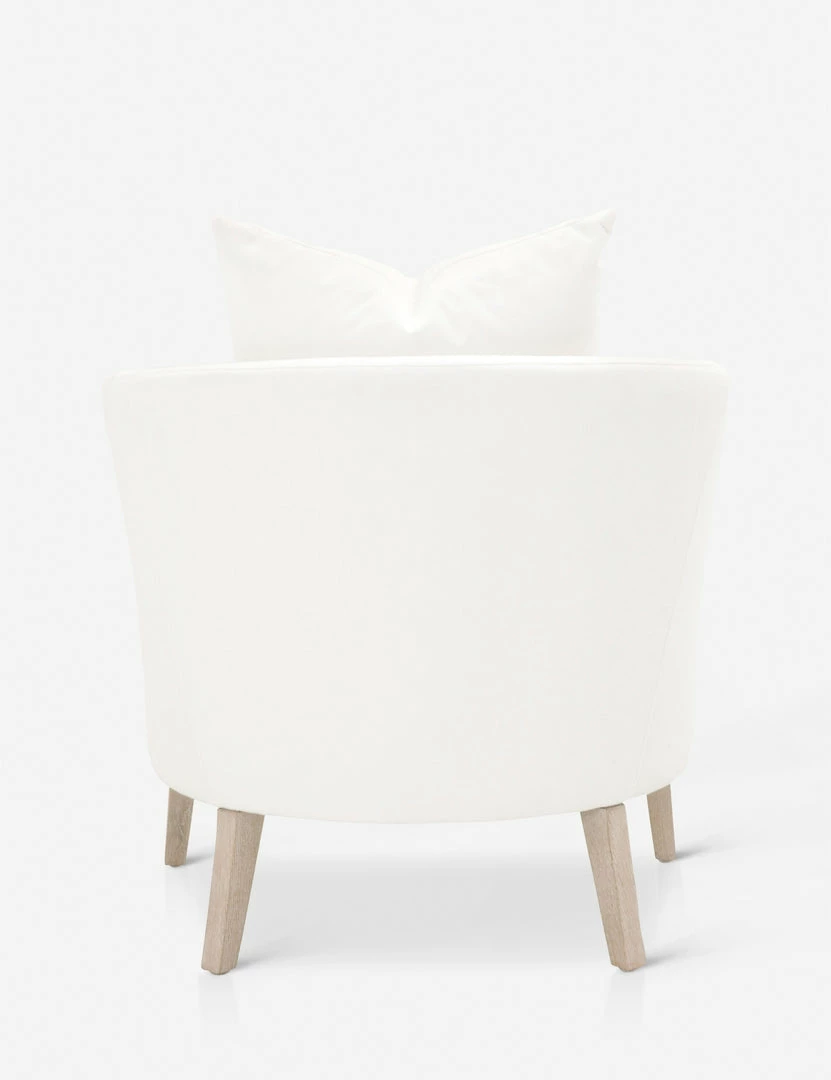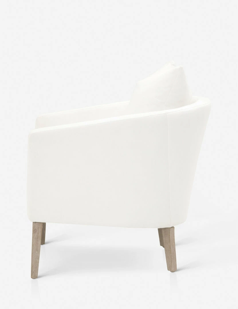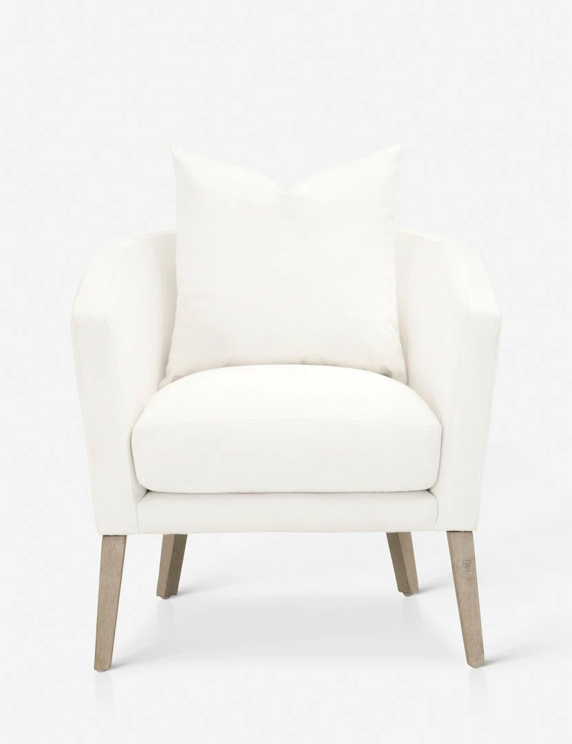 A clean, minimal design gets stylishly paired with maximum comfort for this occasional chair. Its barrel chair silhouette is wrapped in pearl white performance fabric upholstery and features a square throw pillow and solid oak legs. This accent chair offers transitional appeal, easily adapting to different looks.
