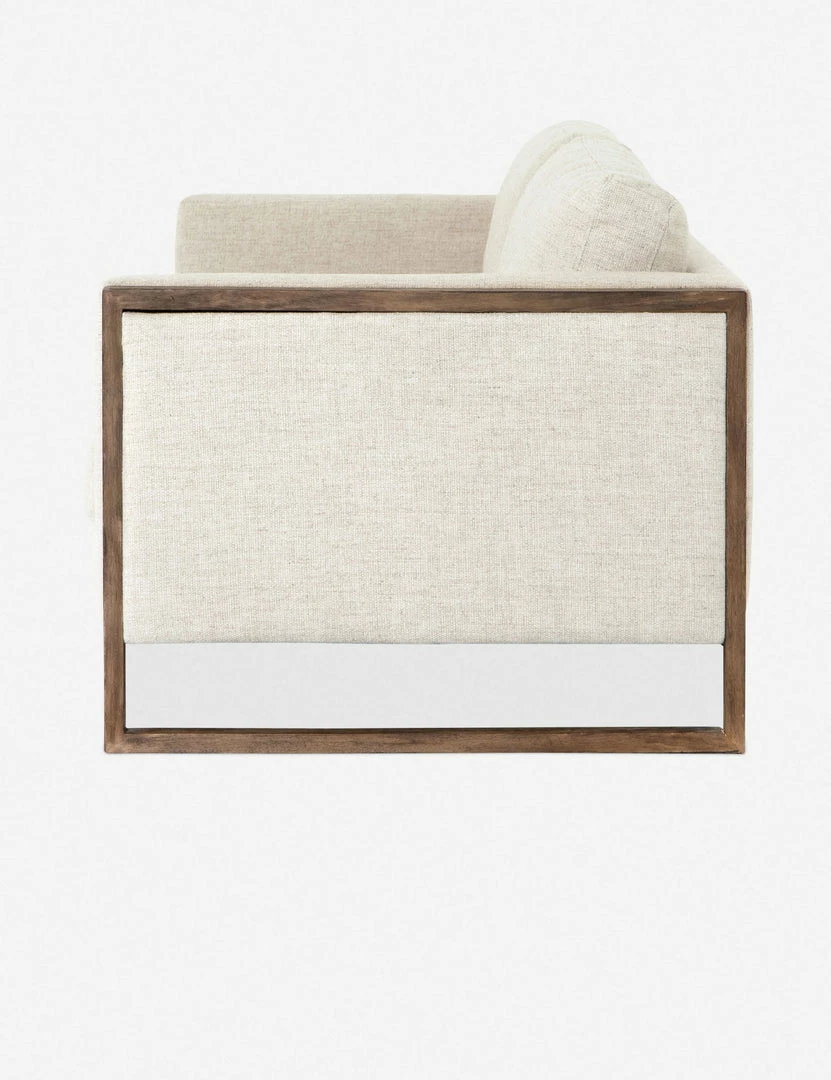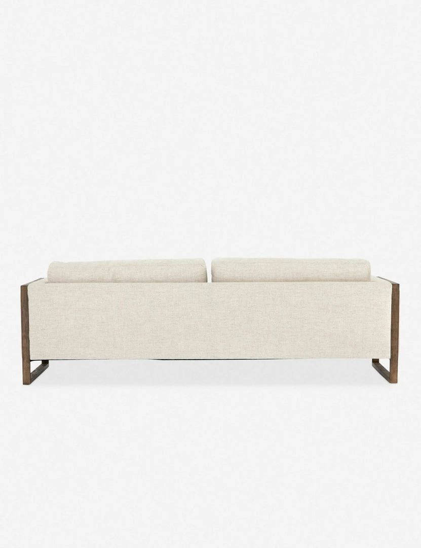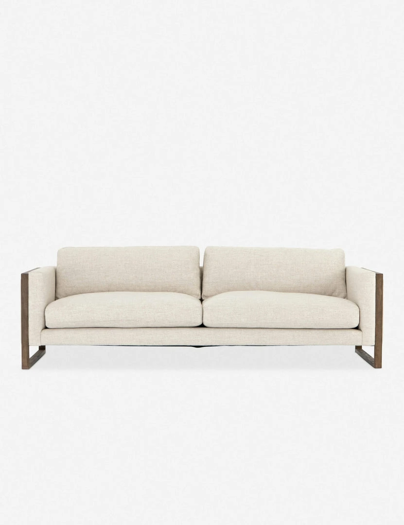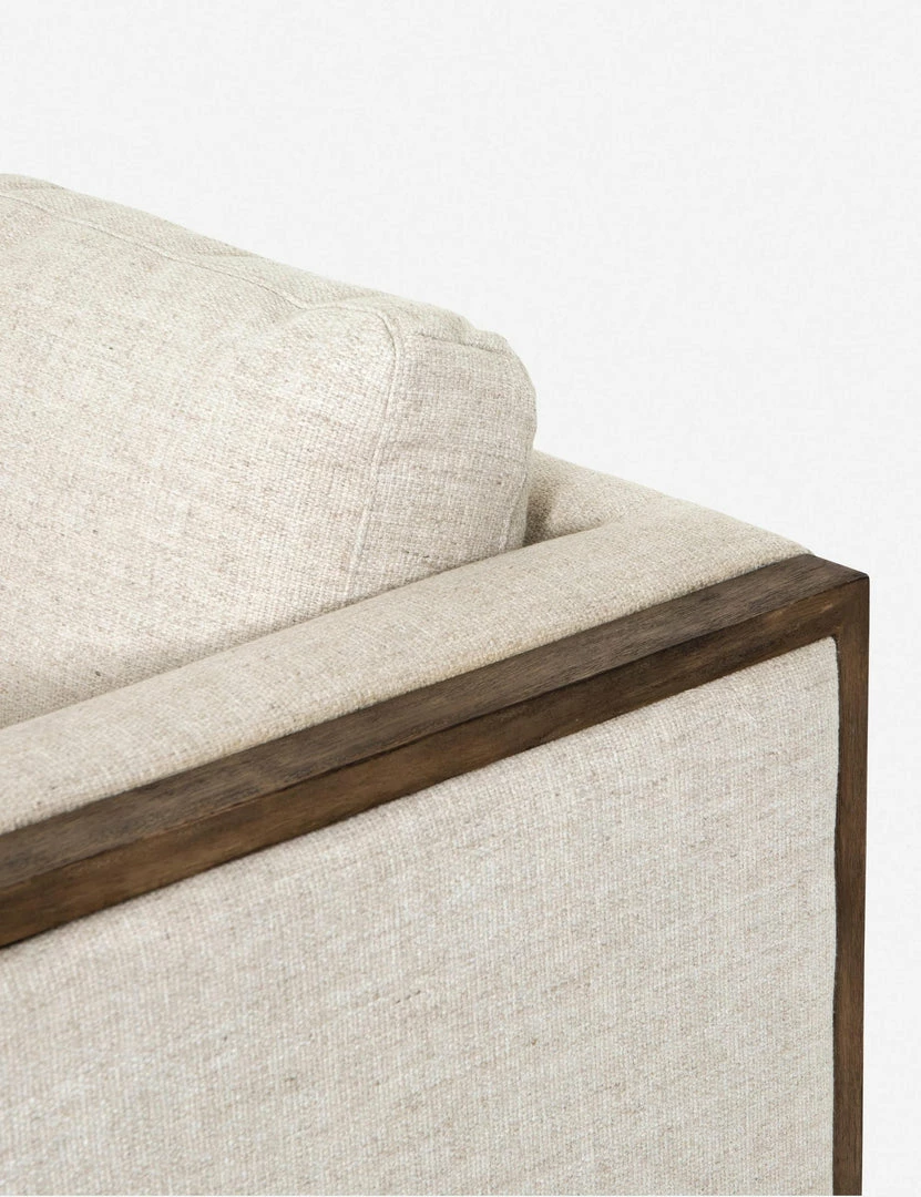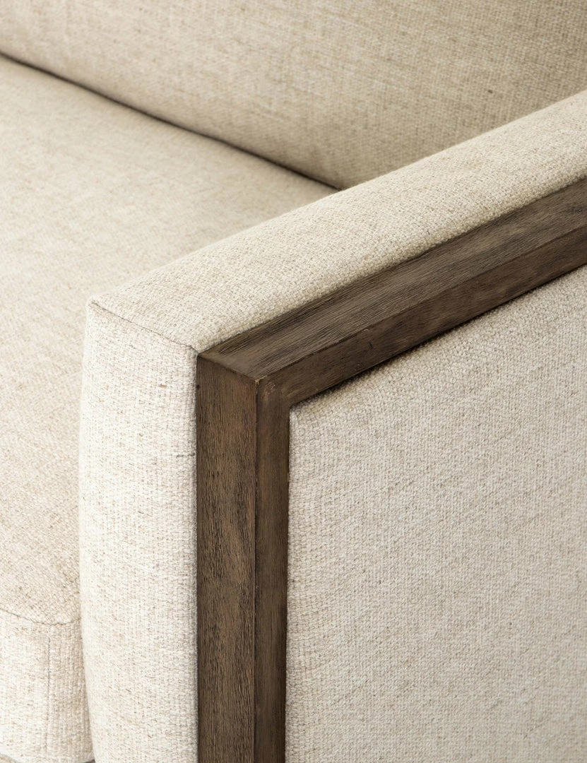A transitional sofa that easily goes contemporary. With a versatile cream upholstery, cozy cushions, and a cutout, exposed wood frame, it perfectly combines minimalistic tendencies with an inviting, homey aesthetic.