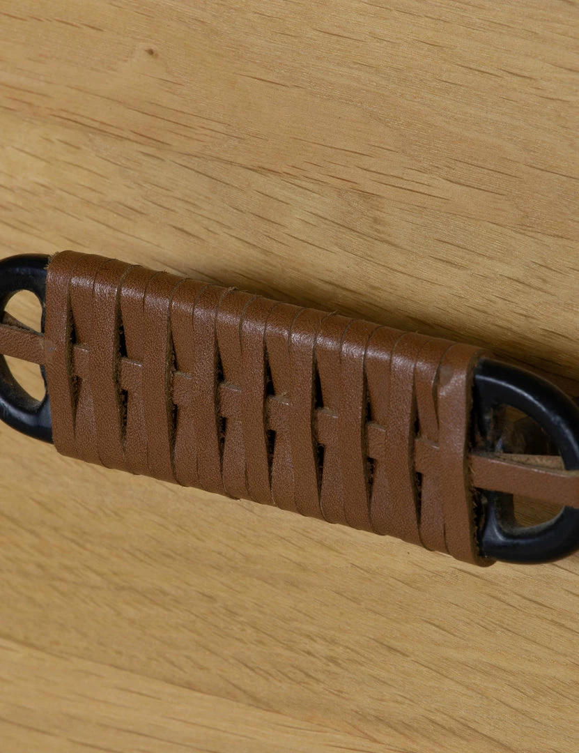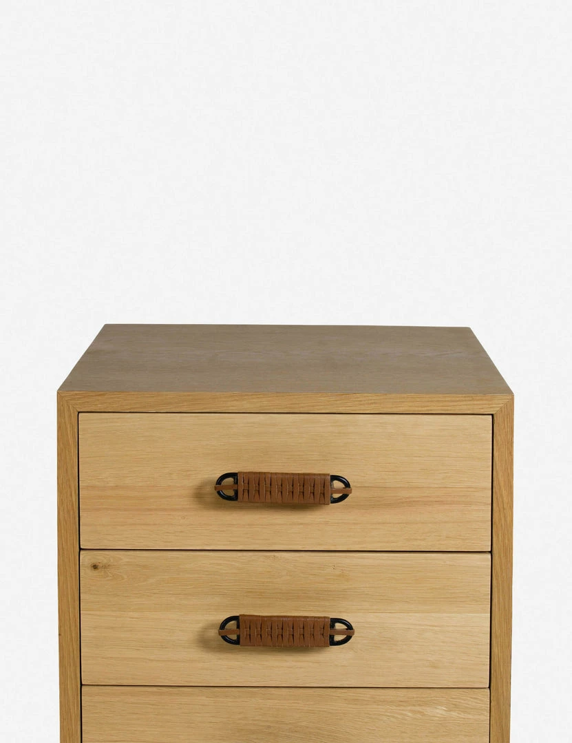 The Jaramillo collection features solid, squared oak construction, fitted with leather-wrapped, wrought iron pulls and legs for a timeless mixed material build. This side table is fashioned with two soft-close drawers to offer spacious storage in a versatile design you can style as a nightstand or end table.