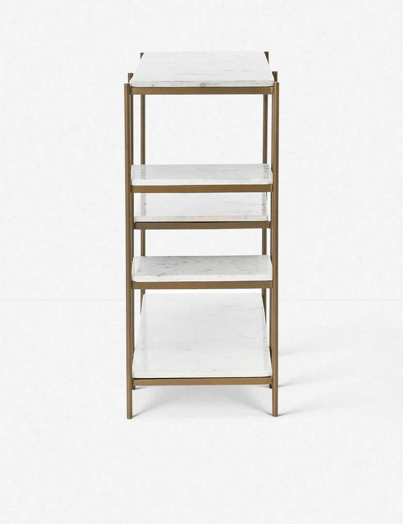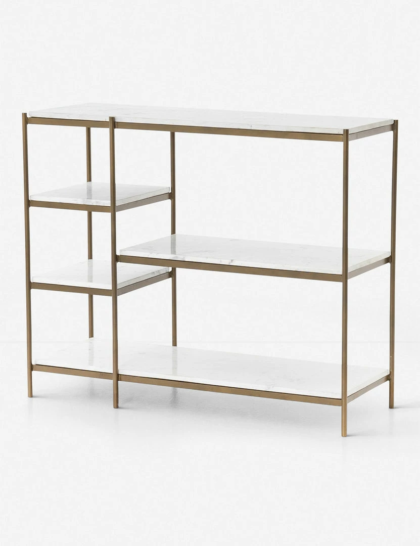 Marble shelves bring a luxe finish to this modern console table, finished with an antique-gold frame and versatile open design. Perfect for contemporary living and dining rooms.