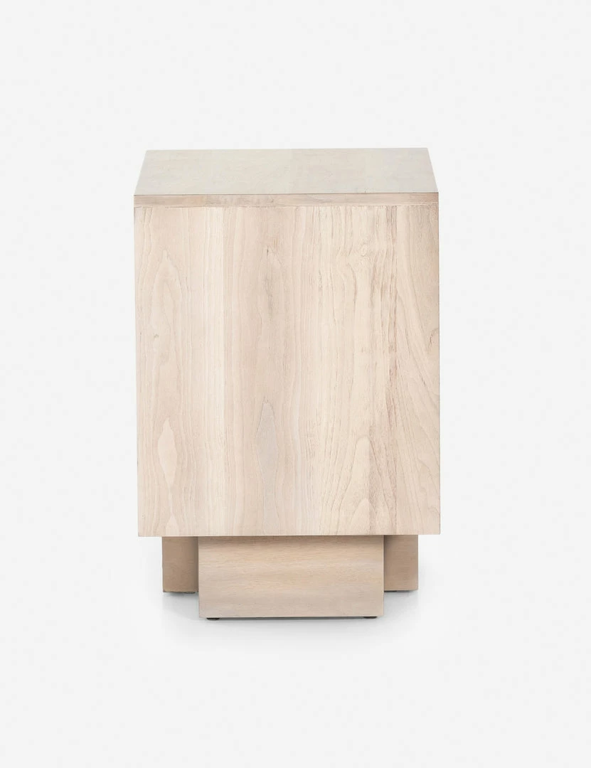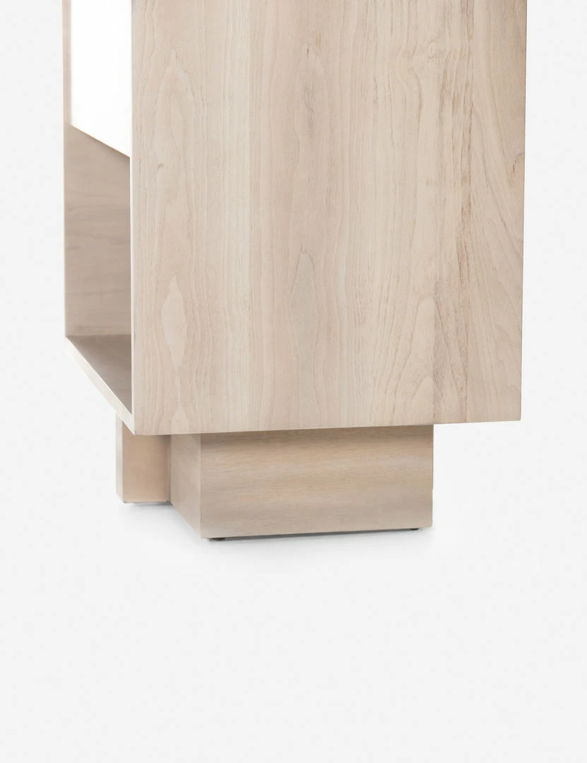 A crisp, tailored design with an ashen walnut veneer lends this nightstand a light air. Its neat mahogany plinth base supports an open shelf and snug drawer featuring a hidden push-latch open to offer practical touches with a refined profile. We love it styled as a bedside table with a modern table lamp or sculptural accent to bring out its understated elegance.