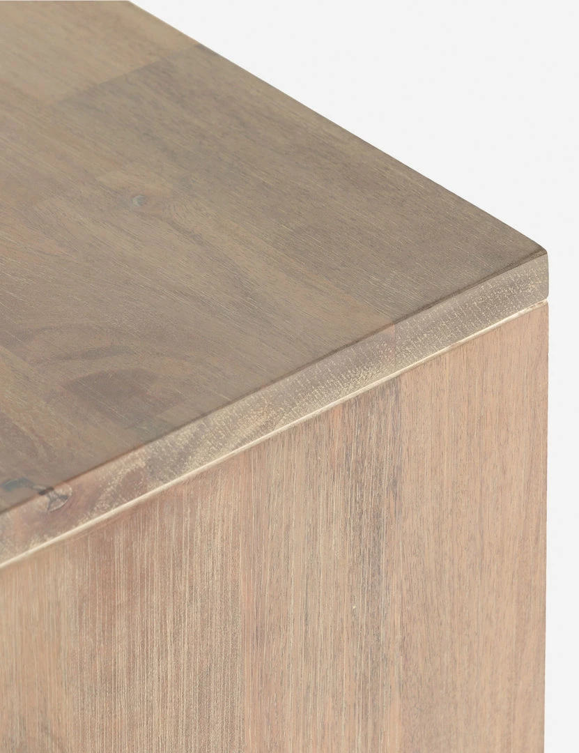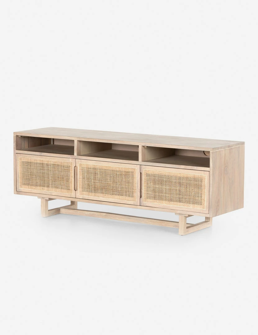 A timeless, clean-lined silhouette is elevated by detail-rich wood grain and woven cane door fronts to create this Margot Media Console. Crafted from natural mango wood, its whitewashed finish complements the three cane doors for a tonal storage piece. Three open shelves offer even more storage.