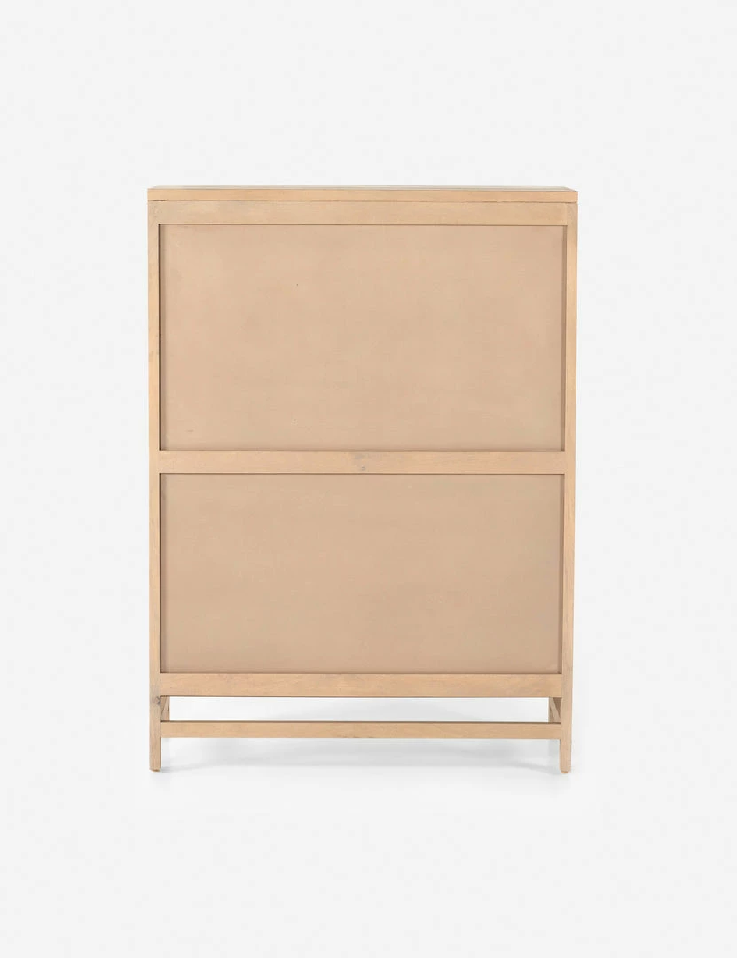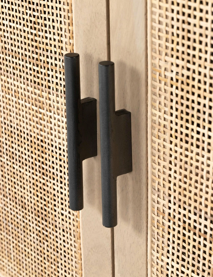 This bar cabinet is crafted with solid mango wood and woven cane paneling then finished with sleek iron hardware for layers of natural texture. A spacious interior features storage for stemware while a drop-down front makes the perfect surface for glassware and spirits. We love its organic warm tones for a transitional space.