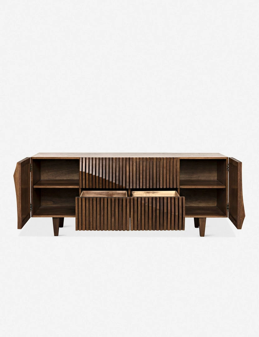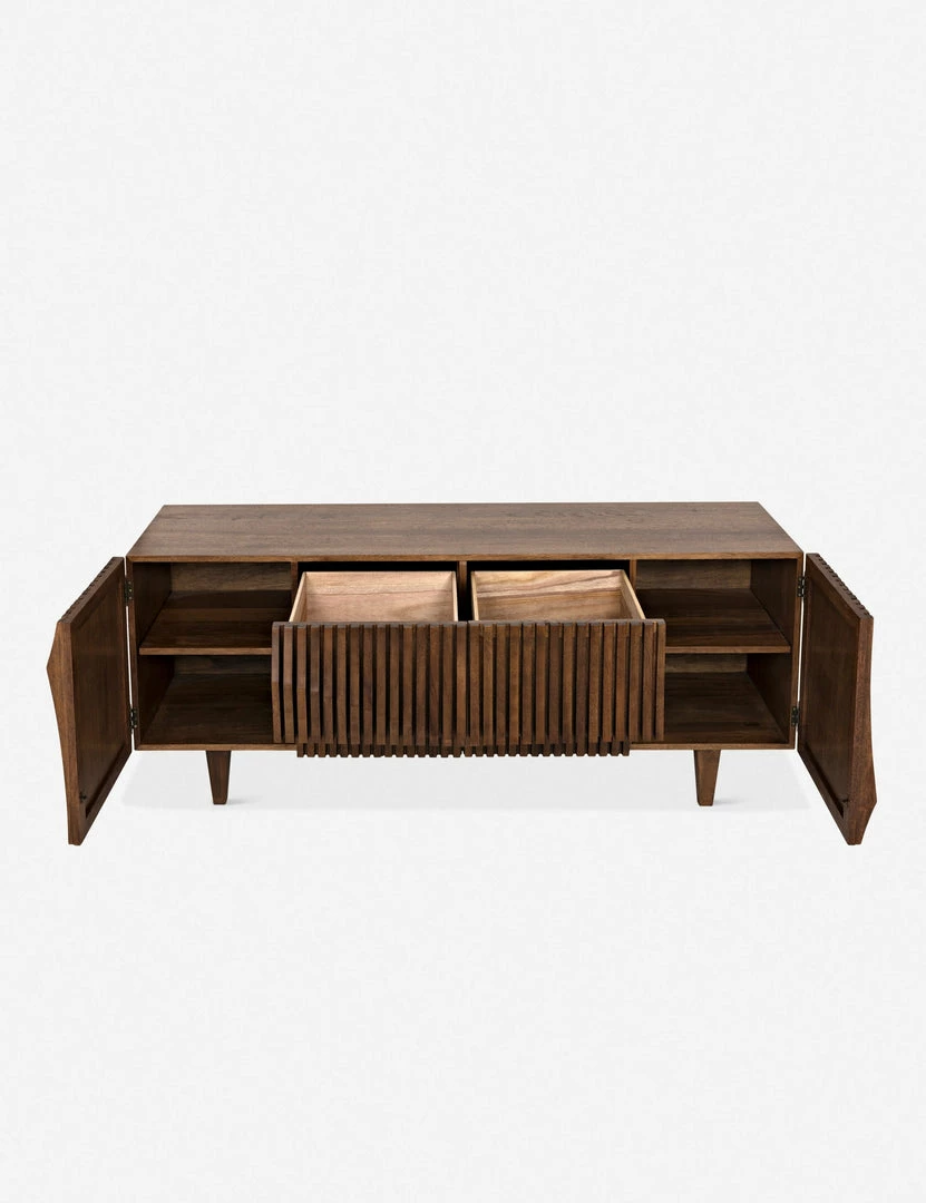 When it comes to dimensional style, this sideboard cabinet has you covered. The deep wood tones are instantly elegant, with deeply grooved, slatted cabinet fronts for an undeniably modern appeal.