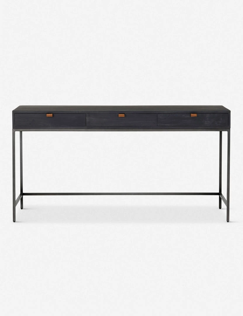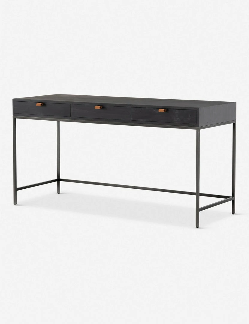 Keep your office style grounded (and super organized) with this wooden desk. Features elements of mid-century aesthetics like a black wash, slim iron base, and top-grain leather drawer pulls.