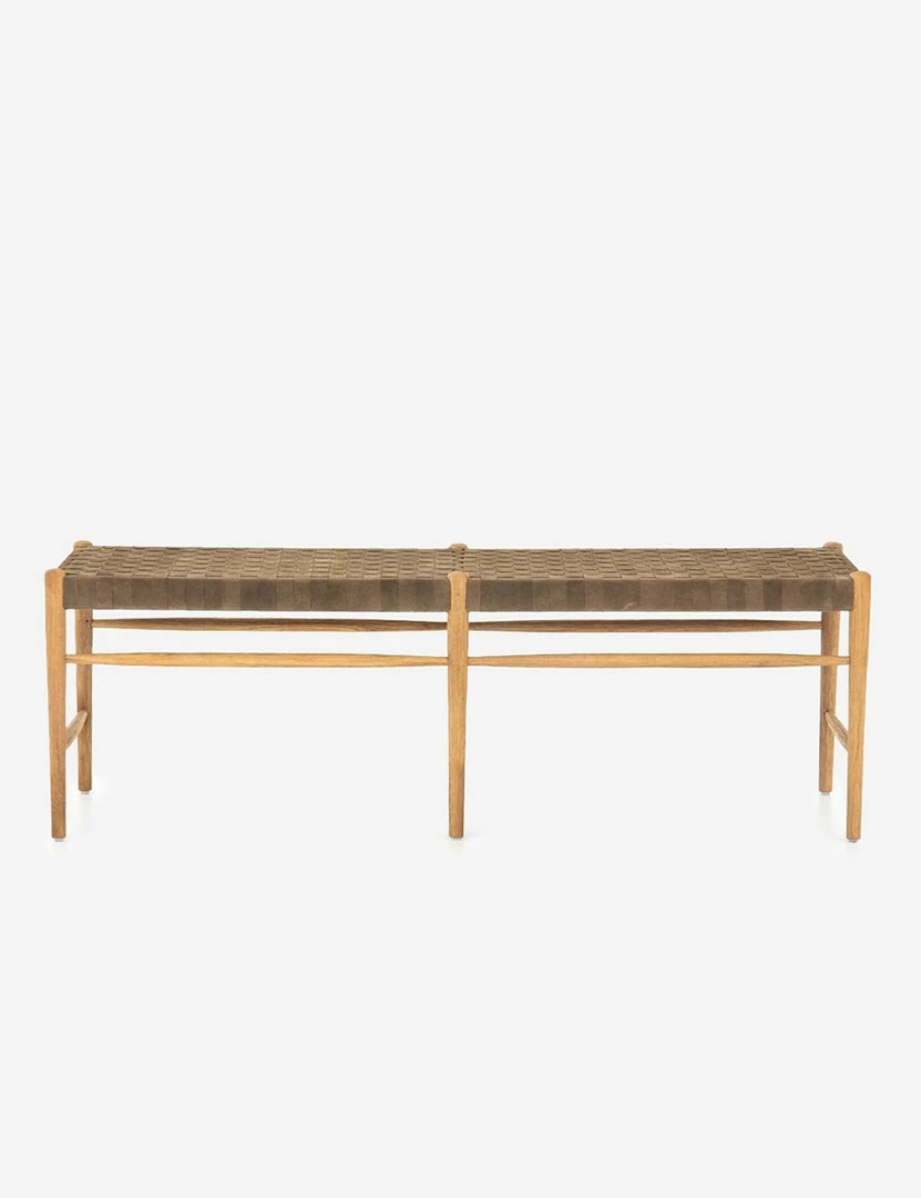 Tapered dowels give this classic bench seating a more modern look, finished in a light oak stain for a dose of natural warmth. The woven leather seat adds contrast in texture and color, and we can’t get enough.