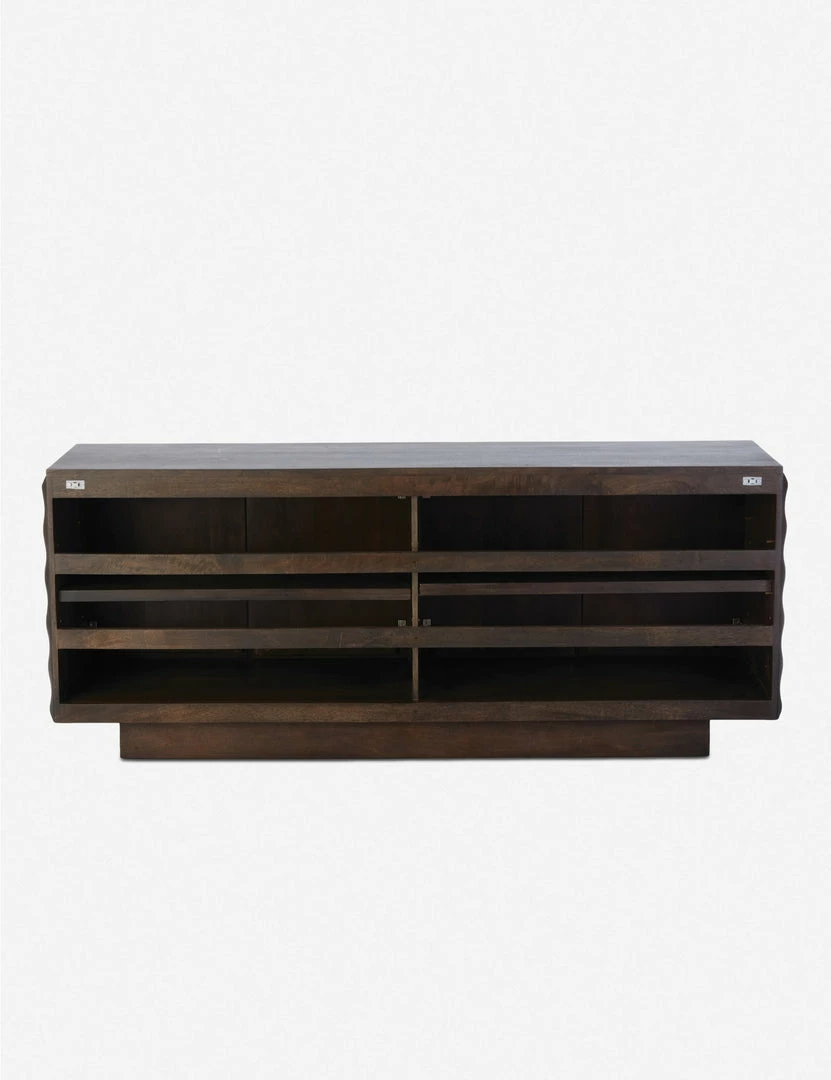 A mix of mod textures and modern design makes this sideboard a statement-making storage option. The rich greyed walnut finish and intricately carved wavy design bring dimension and movement to the piece, which sits on a smooth plinth base. We’re styling this in contemporary dining rooms and mid-century media rooms.