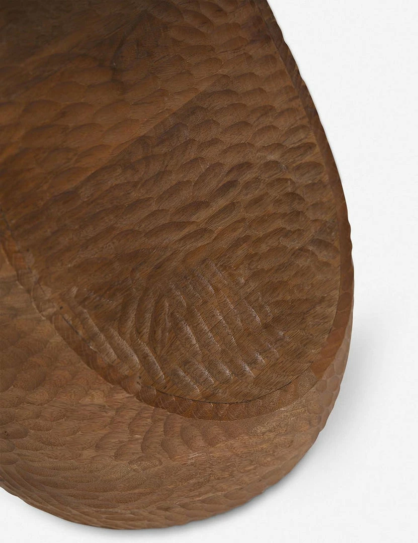This artisan handmade side table is carved and features rich textural appeal. The playfully balanced designed and handcrafted details make this mango wood end table an eye-catching accent for the edge of a sleek sofa, between two accent chairs, or even bedside.